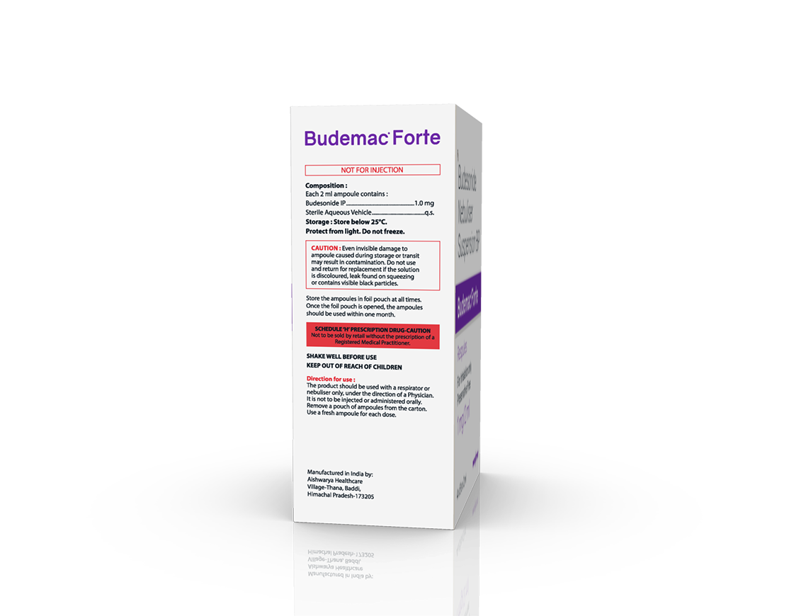 Budemac Fort Respules Budesonide 1 mg / 2 ml Respiratory Suspension Pack : 2 ml Respule Enquiry Categories: Paediatric Care, Pharma, Physician, Specialities Tag: Pharma Description Additional information Description Budemac Fort Respules Composition: Budesonide 1 mg / 2 ml Respiratory Suspension Therapeutic Segment: Pulmonary Disease (COPD) Packing: 2 ml respule Indications: Maintenance Treatment of Asthma Ulcerative Colitis Crohn’s Disease Dosage: Children – 0.5 – 1 mg daily, Adults – 0.5 – 2 mg daily or as directed by the Physician Also Available Budemac Respules | Budemac-F Respules | Budemac-L Respules Additional information Dosage Form Respules Therapeutic Segment Pulmonary Disease (COPD) ENQUIRY! Related Products Glycohist-F DPI CAPS Glycopyrrolate 25 mcg & Formoterol Fumarate 6 mcg Pack : 30 Capsules ENQUIRY! Enquiry Budemac-F 400 DPI CAPS Formoterol 6 mcg & Budesonide 400 mcg Pack : 30 Capsules ENQUIRY! Enquiry Tiodac DPI CAPS Tiotropium Bromide Powder for Inhalation 18 mcg Pack : 30 Capsules ENQUIRY! Enquiry Budemac-F1 Respules Formoterol 20 mcg & Budesonide 1 mg Pack : 2 ml Respule ENQUIRY! Enquiry Related products Altum Plus Tablet Albendazole 400 mg & Ivermectin 6 mg Tablet Pack : 1 x 10 Blister Pack in Mono Carton ENQUIRY! Enquiry Aclopride-TH8 Tablets Aceclofenac 100 mg & Thiocolchicoside 8 mg Pack : 1 x 10 Alu-Alu Pack ENQUIRY! Enquiry Acetazone 250 mg Tablets Acetazolamide 250 mg Pack : 1 x 10 Blister Pack ENQUIRY! Enquiry Alfumac-ER 10 mg Tablets Alfuzosin 10 mg Extended Release Tablets Pack : 1 x 10 Alu-Alu Pack ENQUIRY! Enquiry