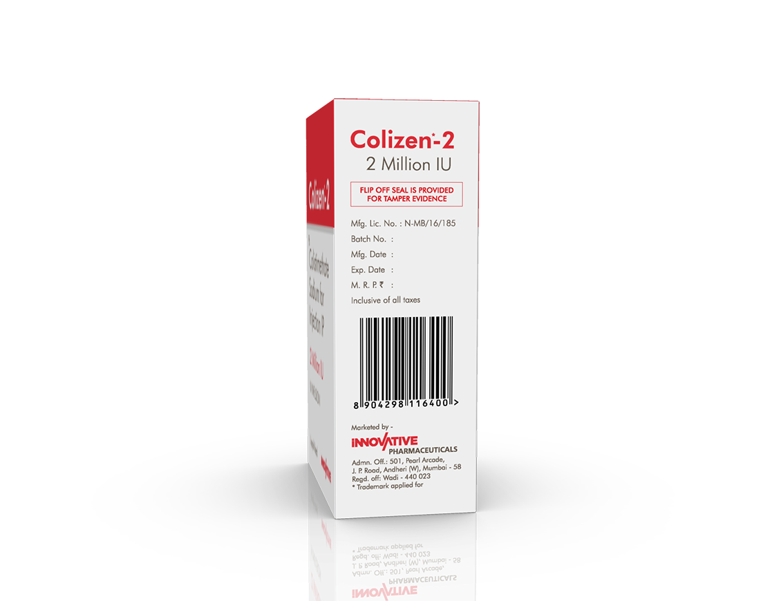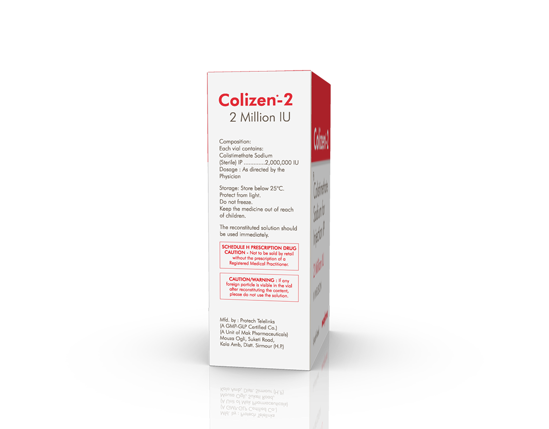 Colizen-2 Injection Colistimethate Sodium 2 Million IU (Lyophilized) Pack : 10 ml Tubular Vial, 10 ml WFI, 10 ml Disposable Syringe & Insert in Tray with Cover in Mono Carton Enquiry Categories: Injectable Care, Pharma, Physician, Specialities, Surgical Care, Urology Care Tag: Pharma Description Additional information Description Colizen-2 Injection Composition : Colistimethate Sodium 2 Million IU (Lyophilized) Therapeutic Segment : Antibiotic | Anti-Infectivec Packing : 10 ml Tubular Vial, 10 ml WFI, 10 ml Disposable Syringe & Insert in Tray with Cover in Mono Carton Indications : Severe bacterial infections Dosage : In critically ill patient loading dose of 9 MIU should be administered. Maintenance dose of 9 MIU/day in 2 to 3 divided doses. or as directed by Physician Product Enquiry Product Information Product DescriptionColizen-2 Injection is an antibiotic that fights bacteria. It is used to treat severe bacterial infections of the body. It is commonly used for critically ill patients admitted to the hospital. BenefitsUrinary tract infections Direction For Use Colizen-2 Injection is generally given under the supervision of a doctor or a nurse and should not be self-administered. The doctor will decide the dose and duration of the treatment. Mechanism of ActionColizen-2 Injection is an antibiotic. It kills bacteria by destroying the bacterial cell membrane. They target the outer membrane of bacteria, disrupting its structure. By inhibiting bacterial growth, they help control the infection and promote healing. Also AvailableColizen-1 Injection Additional information Dosage Form Injectable Therapeutic Segment Anti-Infective, Antibiotic ENQUIRY! Related Products Netrobact 50 mg Injection Netilmicin 50 mg / ml Pack : 1 ml Clear Ring Ampoule & Insert in Tray with Mono Carton ENQUIRY! Enquiry Netrobact 10 mg Injection Netilmicin 10 mg / ml Pack : 1 ml Clear Ring Ampoule & Insert in Tray with Mono Carton ENQUIRY! Enquiry Uniclave Drops Amoxycillin 80 mg & Potassium Clavulanate 11.4 mg / ml Pack : 10 ml HDPE Bottle with 10 ml WFI & Dropper in Mono Carton ENQUIRY! Enquiry Cephazone Dry Syrup Cephalexin 250 mg / 5 ml Pack : 30 ml Bottle with WFI in Mono Carton ENQUIRY! Enquiry Related products Aclopride-MR Tablets (Blister) Aceclofenac 100 mg, Paracetamol 325 mg & Chlorzoxazone 250 mg Pack : 1 x 10 Tablets Blister Pack ENQUIRY! Enquiry Alrest 0.25 mg Tablets Clonazepam 0.25 mg Pack : 1 x 10 Blister Pack ENQUIRY! Enquiry Altum Plus Tablet Albendazole 400 mg & Ivermectin 6 mg Tablet Pack : 1 x 10 Blister Pack in Mono Carton ENQUIRY! Enquiry Aclopride-TA Tablets Aceclofenac 100 mg, Tramadol 37.5 mg & Paracetamol 325 mg Pack : 1 x 10 Tablets Blister Pack ENQUIRY! Enquiry