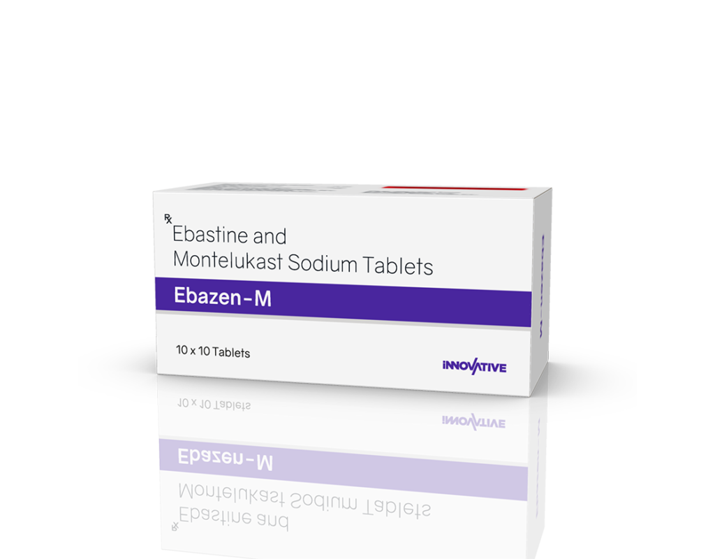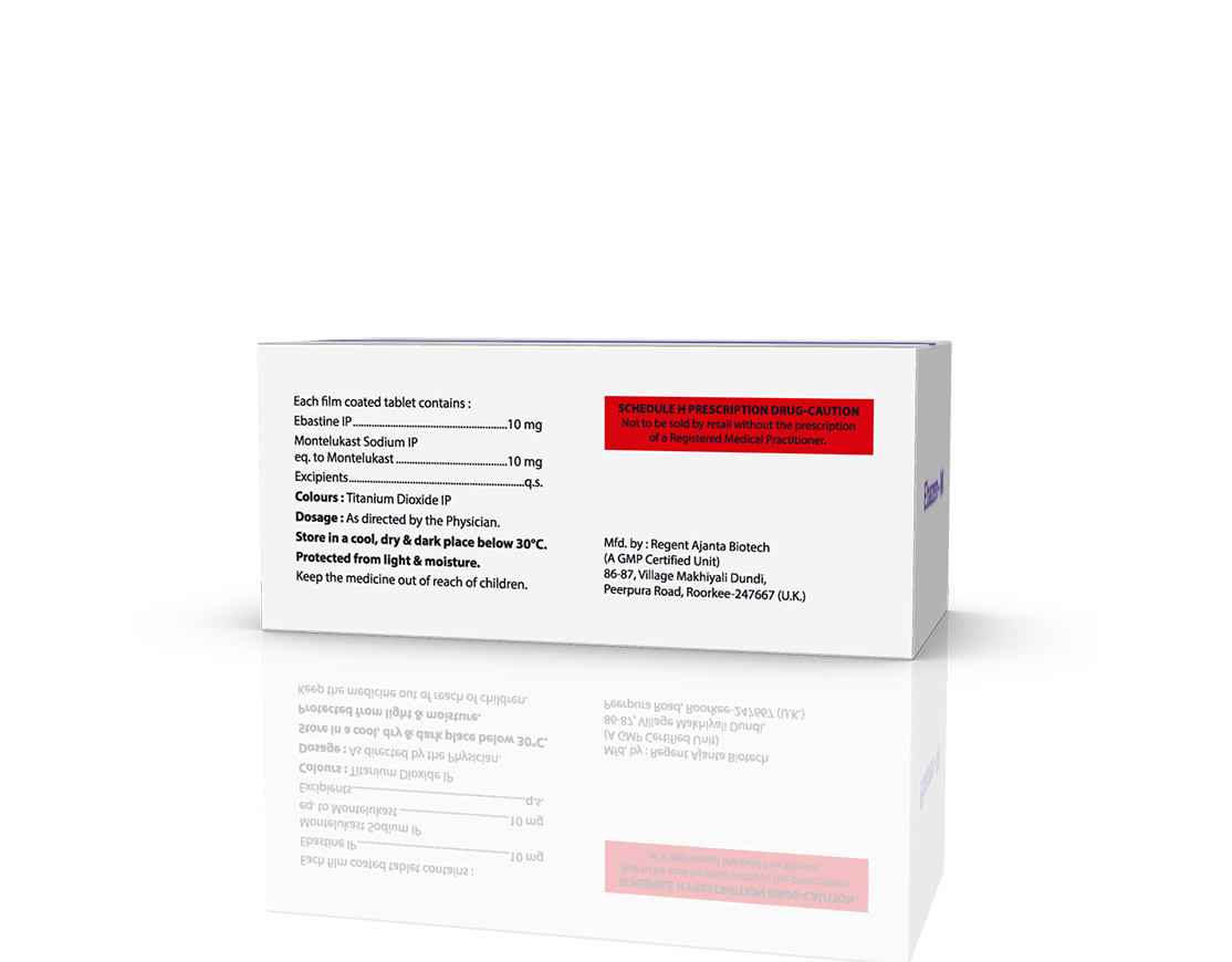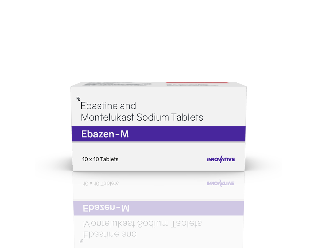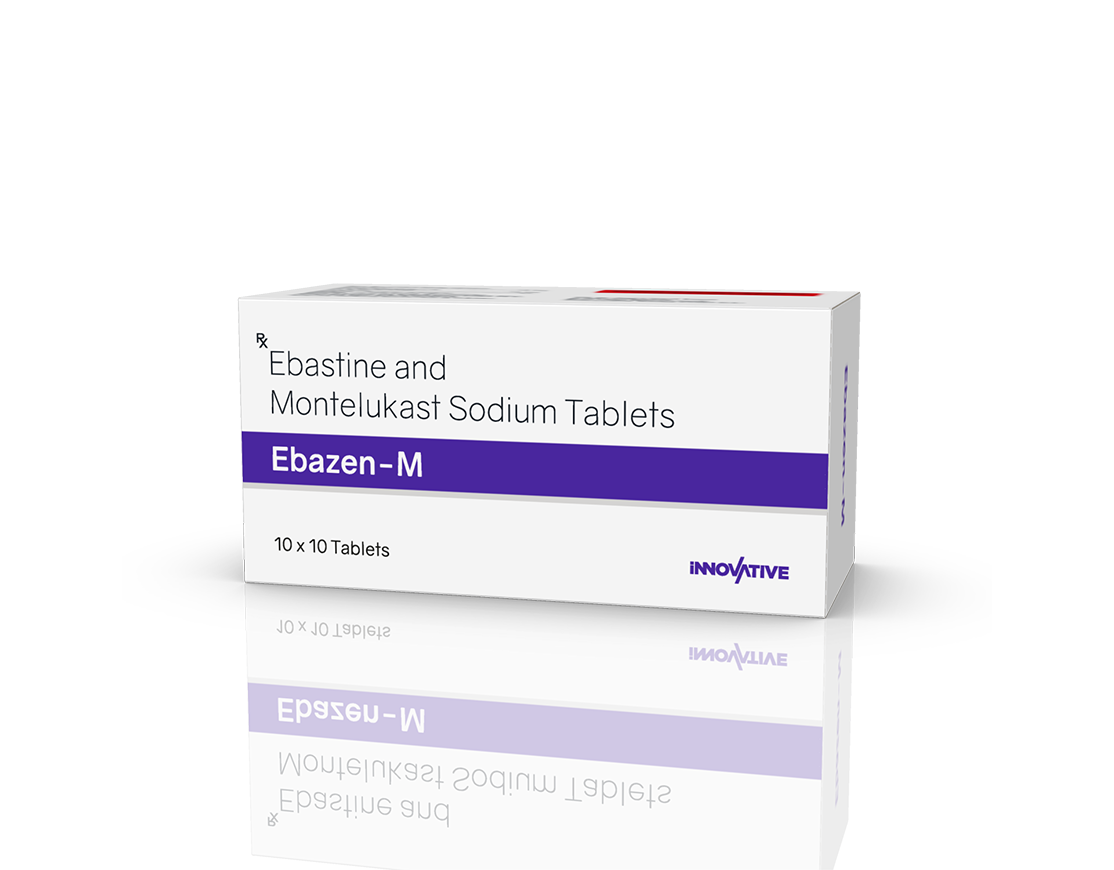 Ebazen-M Tablets Ebastine 10 mg & Montelukast 10 mg Pack : 1 x 10 Tablets Alu-Alu Pack Enquiry Categories: Derma Care, ENT Care, Pharma, Physician, Specialities Tag: Pharma Description Additional information Description Ebazen-M Tablets Composition : Ebastine 10 mg & Montelukast 10 mg Therapeutic Segment : Antiallergic Packing : 1 x 10 Tablets (Alu-Alu Pack) Indications : Recurrent Allergic Conditions COPD Acute & Chronic Bronchitis Asthmatic Bronchitis Seasonal/ Perennial Allergic Rhinitis Chronic Idiopathic Urticaria Dosage : 1 Tablet once daily or as directed by Physician Also Available Ebazen 10 mg Tablets | Ebazen 20 mg Tablets Additional information Dosage Form Tablets Therapeutic Segment Antiallergic ENQUIRY! Related Products Lezest-M Tablets Montelukast 10 mg & Levocetirizine 5 mg Pack : 1 x 10 Tablets Alu-Alu Pack ENQUIRY! Enquiry Broncorest-AX Syrup Dextromethorphan 10 mg, Ambroxol 15 mg, Chlorpheniramine Maleate 2 mg & Phenylephrine 5 mg / 5 ml Pack : 100 ml Bottle with Measuring Cap in Mono Carton ENQUIRY! Enquiry Ketotide Syrup Ketotifen 1 mg / 5 ml Pack : 60 ml Bottle in Mono Carton ENQUIRY! Enquiry Cetzest Syrup Cetirizine 5 mg / 5 ml Pack : 60 ml Bottle with Measuring Cap ENQUIRY! Enquiry Related products Alconix 500 mg Tablets Disulfiram 500 mg Pack : 1 x 4 Blister in Mono Carton ENQUIRY! Enquiry Aclopride Gel Aceclofenac, Linseed Oil, Methyl Salicylate, Menthol & Capsaicin Pack : 30 g Lami Tube In Mono Carton ENQUIRY! Enquiry Aclopride-P Tablets (Blister) Aceclofenac 100 mg & Paracetamol 325 mg Pack : 1 x 10 Tablets Blister Pack ENQUIRY! Enquiry Aclopride-MR Tablets (Blister) Aceclofenac 100 mg, Paracetamol 325 mg & Chlorzoxazone 250 mg Pack : 1 x 10 Tablets Blister Pack ENQUIRY! Enquiry