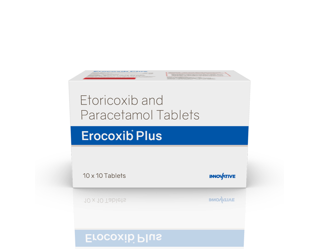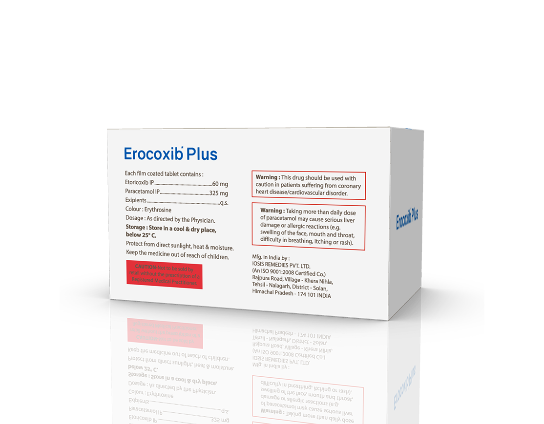 Erocoxib Plus Tablets (1 x 10) Etoricoxib 60 mg & Paracetamol 325 mg Pack : 1 x 10 Tablets Alu-Alu Pack Enquiry Categories: Dental Care, General Practitioner, Orthopaedic Care, Pharma, Physician, Specialities Tag: Pharma Description Additional information Description Erocoxib Plus Tablets (1x10) Composition : Etoricoxib 60 mg & Paracetamol 325 mg Therapeutic Segment : Anti-inflammatory | Analgesic Packing : 1 x 10 Tablets (Alu-Alu Pack) Indications : Mild to moderate pain like headache, toothache, muscle-aches, back ache Arthritis – O.A. & R.A. Gout Pyrexia Low Back Pain Dysmenorrhoea Dosage : 1 Tablet twice daily after meals or as directed by Physician Product Description : It is a pain-relieving medicine. It is used to reduce pain and inflammation in conditions like rheumatoid arthritis, ankylosing spondylitis, and osteoarthritis. Work Mechanism : Etoricoxib and Paracetamol. Etoricoxib is a non-steroidal anti-inflammatory drug (NSAID) and Paracetamol is an antipyretic (fever reducer). They work by blocking the release of certain chemical messengers in the brain that cause pain and fever. Also Available Erocoxib 120 mg Tablets | Erocoxib 60 mg Tablets | Erocoxib 90 mg Tablets (1 x 10) | Erocoxib-MR 4 mg Tablets | Erocoxib-MR 8 mg Tablets | Erocoxib 90 mg Tablets (1 x 15) | Erocoxib Plus Tablets (1 x 15) Additional information Dosage Form Tablets Therapeutic Segment Analgesic, Anti-Inflammatory ENQUIRY! Related Products Napromac 250 mg Tablets Naproxen 250 mg Pack : 1 x 10 Tablets Blister Pack ENQUIRY! Enquiry Domzest-P Tablets Domperidone 10 mg & Paracetamol 325 mg Pack : 1 x 10 Tablets Blister Pack ENQUIRY! Enquiry Diclozed-TH Capsules Diclofenac Potassium 50 mg & Thiocolchicoside 4 mg Pack : 1 x 10 Capsules Blister Pack ENQUIRY! Enquiry Tramapride-D Tablets Tramadol Hydrochloride 50 mg & Diclofenac Sodium 75 mg Pack : 1 x 10 Tablets Alu-Alu Pack ENQUIRY! Enquiry Related products Aclopride-SP Tablets Aceclofenac 100 mg, Paracetamol 325 mg & Serratiopeptidase 15 mg Pack : 1 x 10 Blister Pack ENQUIRY! Enquiry Acetazone 250 mg Tablets Acetazolamide 250 mg Pack : 1 x 10 Blister Pack ENQUIRY! Enquiry Altum Suspension Albendazole 200 mg / 5 ml Pack : 10 ml Bottle in Mono Carton ENQUIRY! Enquiry Alconix 500 mg Tablets Disulfiram 500 mg Pack : 1 x 4 Blister in Mono Carton ENQUIRY! Enquiry