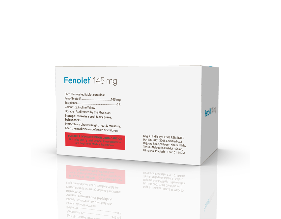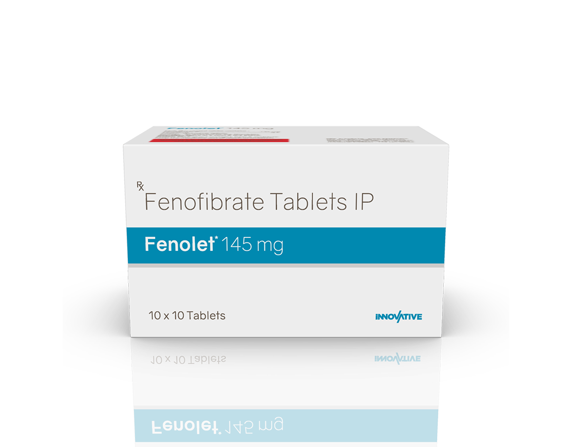 Fenolet 145 mg Tablets Fenofibrate 145 mg Pack : 1 x 10 Tablets Alu-Alu Pack Enquiry Categories: Cardio Diabetic Care, Pharma, Physician, Specialities Tag: Nutraceutical Description Additional information Description Fenolet 145 mg Tablets Composition : Fenofibrate 145 mg Therapeutic Segment : Lipid Lowering Agent Packing : 1 x 10 Tablets (Alu-Alu Pack) Indications : Hypercholesterolemia Dyslipidemia Dosage : 1 Tablet once daily or as directed by Physician Product Enquiry Product Information Product DescriptionFenofibrate Tablets is used to treat high cholesterol. This medicine helps by lowering triglycerides and “bad” cholesterol (LDL), while at the same time raising the levels of “good” cholesterol (HDL). Lowering cholesterol levels reduces the risk of heart attack and stroke. Benefits Hypertriglyceridemia Patient at high risk of CHD Direction For Use Take this medicine in the dose and duration as advised by your doctor. Swallow it as a whole. Do not chew, crush or break it. Mechanism of ActionFenofibrate is a lipid lowering medication. It works by lowering the levels of triglycerides and “bad” cholesterol (LDL), while raising the levels of “good” cholesterol (HDL). Also AvailableFenolet 160 mg Tablets Additional information Dosage Form Tablets Therapeutic Segment Lipid Lowering Agent ENQUIRY! Related Products Napromac-D Tablets Naproxen 250 mg & Domperidone 10 mg Pack : 1 X 10 Tablets Blister Pack ENQUIRY! Enquiry Globright 3 way antibacterial Face Wash ENQUIRY! Enquiry Livozest Capsules ENQUIRY! Enquiry Atazest Drops Hydroxyzine 10 mg / 5 ml Pack : 15 ml Bottle in Mono Carton ENQUIRY! Enquiry Related products Aclopride-TH8 Tablets Aceclofenac 100 mg & Thiocolchicoside 8 mg Pack : 1 x 10 Alu-Alu Pack ENQUIRY! Enquiry Alconix 500 mg Tablets Disulfiram 500 mg Pack : 1 x 4 Blister in Mono Carton ENQUIRY! Enquiry Aclopride-SP Tablets Aceclofenac 100 mg, Paracetamol 325 mg & Serratiopeptidase 15 mg Pack : 1 x 10 Blister Pack ENQUIRY! Enquiry Aclopride-PT Tablets Aceclofenac 100 mg, Paracetamol 325 mg & Thiocolchicoside 4 mg Pack : 1 x 10 Tablets Alu-Alu Pack ENQUIRY! Enquiry