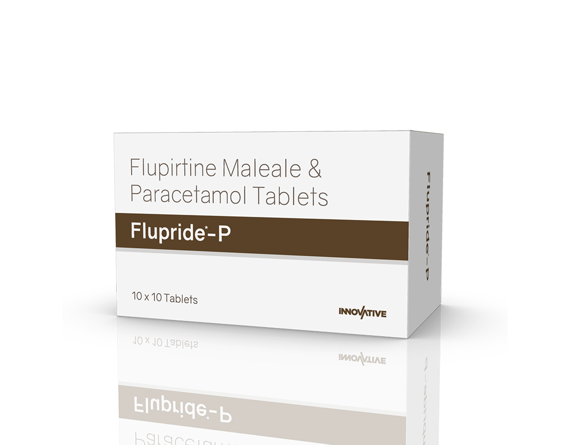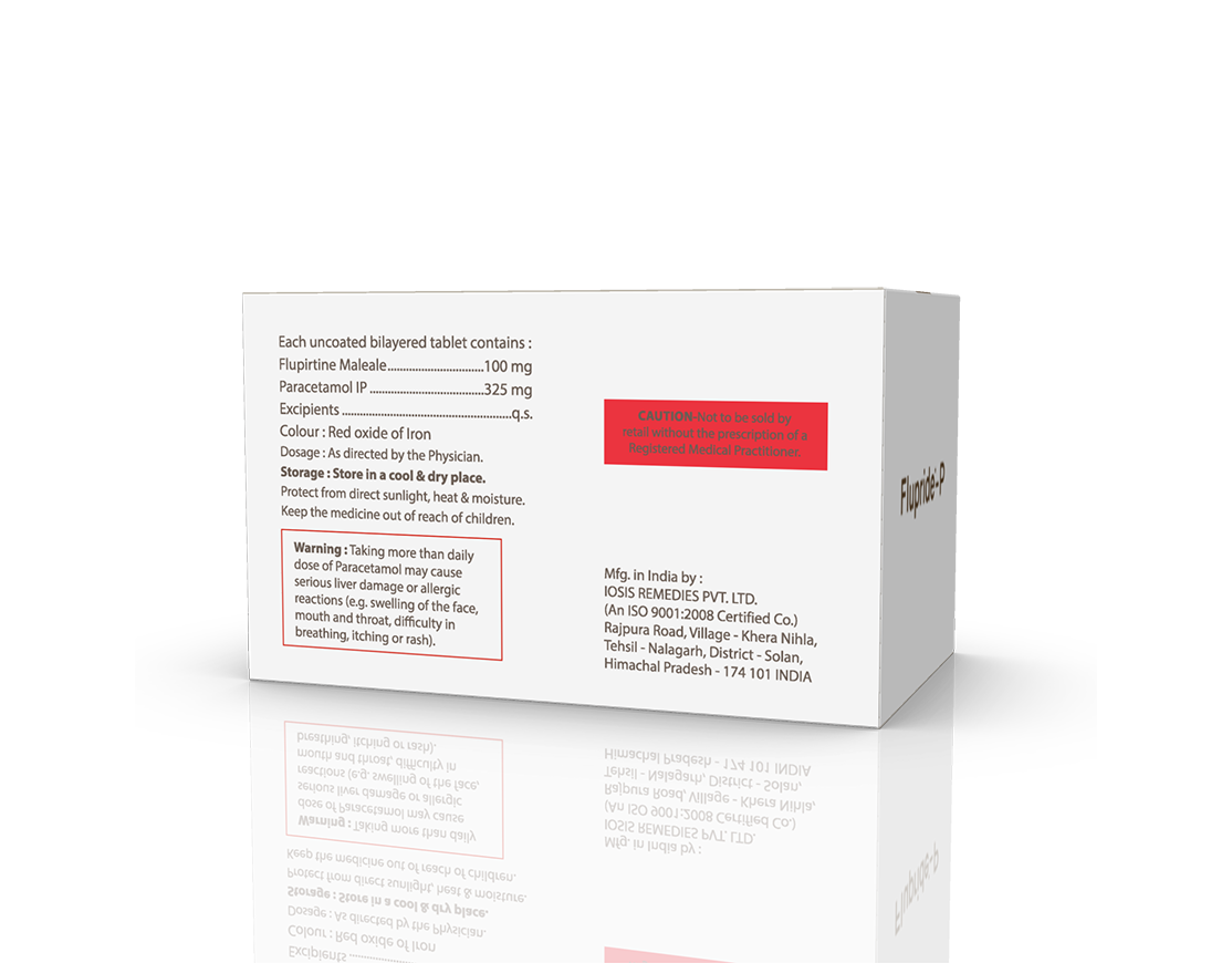 Flupride-P Tablets Flupirtine 100 mg & Paracetamol 325 mg Pack : 1 x 10 Tablets Alu-Alu Pack Enquiry Categories: Neuro Care, Orthopaedic Care, Pharma, Physician, Specialities Tag: Pharma Description Additional information Description Flupride-P Tablets Composition: Flupirtine 100 mg & Paracetamol 325 mg Therapeutic Segment: Analgesics & Antipyretics Packing: 1 x 10 Tablets (Alu-Alu Pack) Indications: Pain relief Dosage: 1 Tablet twice daily or as directed by the Physician Product Enquiry Product Information Product DescriptionFlupride-P Tablets belongs to a group of medicines called pain killers/analgesic used in the Flupirin P Tablet 100mg/325mg is a pain relieving medicine. It is used to treat pain and inflammation in conditions like rheumatoid arthritis, ankylosing spondylitis, and osteoarthritis. It is also used to relieve muscle pain, back pain, toothache, or pain in the ear and throat. BenefitsPain relief Direction For Use Take this medicine in the dose and duration as advised by your doctor. Swallow it as a whole. Do not chew, crush or break it. Mechanism of ActionFlupirtine is an analgesic (pain reliever) which works by blocking transmission of pain signals to the brain to lower pain perception. Paracetamol is an analgesic (pain reliever) and an anti-pyretic (fever reducer) which works by blocking the release of certain chemical messengers that cause fever and pain. Also AvailableFlupride 100 mg Capsules Additional information Dosage Form Tablets Therapeutic Segment Analgesic, Antipyretic ENQUIRY! Related Products Diclozed 50 mg Tablets Diclofenac 50 mg & Paracetamol 325 mg Pack : 1 x 10 Tablets Blister Pack ENQUIRY! Enquiry Lorpride-MR Tablets Lornoxicam 8 mg & Thiocolchicoside 4 mg Pack : 1 x 10 Tablets Alu-Alu Pack ENQUIRY! Enquiry Erocoxib 60 mg Tablets Etoricoxib 60 mg Pack : 1 x 10 Tablets Blister Pack ENQUIRY! Enquiry Lorpride Forte Tablets Lornoxicam 8 mg & Paracetamol 325 mg Pack : 1 x 10 Tablets Blister Pack ENQUIRY! Enquiry Related products Aclopride-MR Tablets (Blister) Aceclofenac 100 mg, Paracetamol 325 mg & Chlorzoxazone 250 mg Pack : 1 x 10 Tablets Blister Pack ENQUIRY! Enquiry Altum Plus Tablet Albendazole 400 mg & Ivermectin 6 mg Tablet Pack : 1 x 10 Blister Pack in Mono Carton ENQUIRY! Enquiry Altum Tablet Albendazole 400 mg Pack : 1 Tab Blister Pack ENQUIRY! Enquiry Aclopride 100 mg DT Aceclofenac 100 mg DT Pack : 1 x 10 Tablets Alu-Alu Pack ENQUIRY! Enquiry