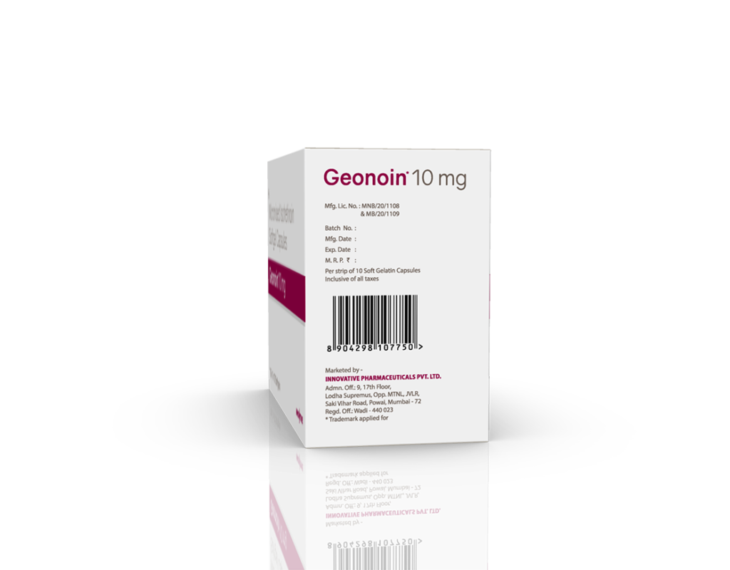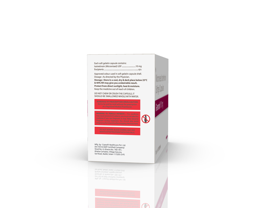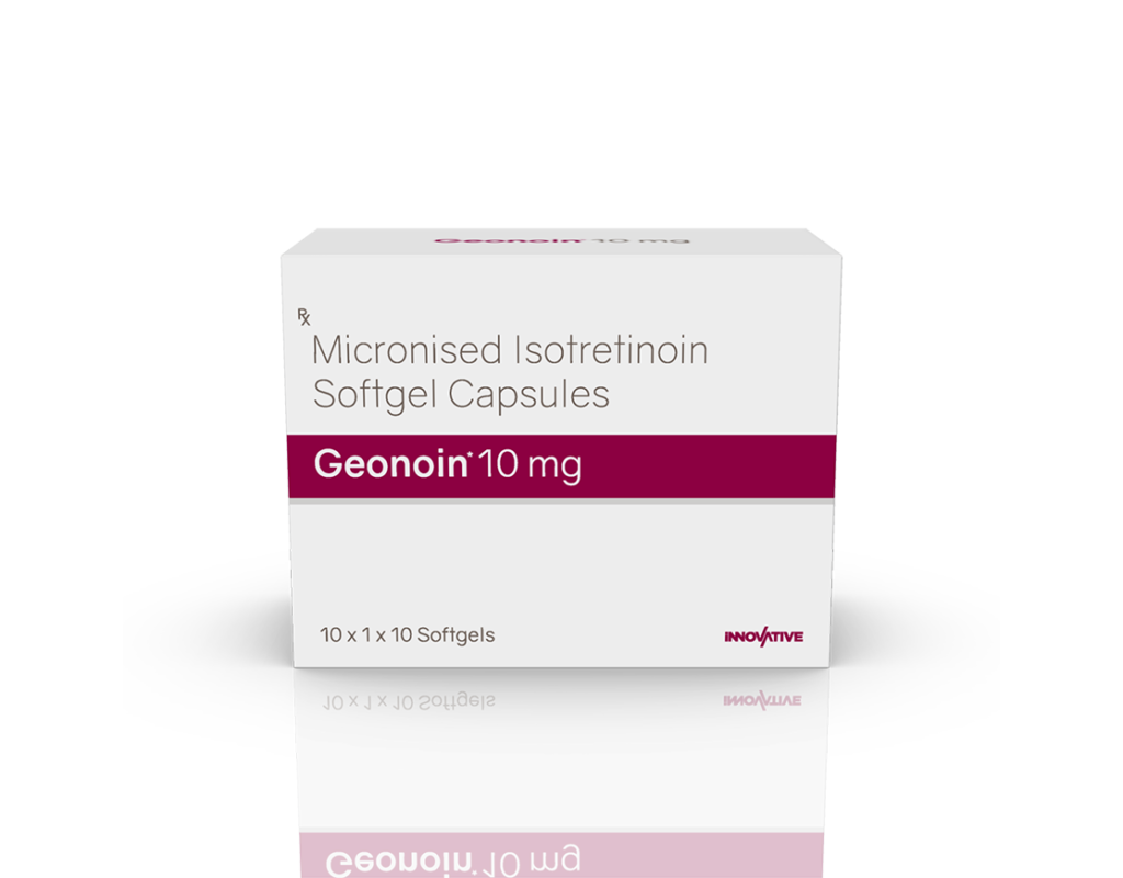 Geonoin 10 mg Softgels Isotretinoin 10 mg (Micronized) Pack : 1 x 10 Softgel Blister Pack in Mono Carton Enquiry Categories: Derma Care, Pharma, Specialities Tag: Pharma Description Additional information Description Geonoin 10 mg Softgels Composition : Isotretinoin 10 mg (Micronized) Therapeutic Segment : Anti-Acne Packing : 1 x 10 Softgel (Blister Pack) in Mono Carton Indications : Treatment of Acne Dosage : 1-2 Softgels Daily or as directed by Physician Product Enquiry Product Information Product DescriptionGeonoin 10 mg Softgels belongs to a group of medicines called retinoids (vitamin A derivative). It is used to treat severe acne that has not responded to other treatments. BenefitsTreatment of Acne Direction For Use Take this medicine in the dose and duration as advised by your doctor. Check the label for directions before use. Measure it with a measuring cup and take it by mouth. Mechanism of ActionGeonoin 10 mg Softgels is a derivative of vitamin A. It acts on glands (sebaceous) to reduce the production of a natural substance (sebum) that causes acne. Also, the controlled sebum production kills acne-causing bacteria. It also works as an anti-inflammatory to decrease inflammation (redness and swelling). Also AvailableGeonoin 20 mg Softgels Additional information Dosage Form Softgels Therapeutic Segment Anti-Acne ENQUIRY! Related Products Clinbid Soap Clindamycin Phosphate 0.1% w/w & Benzoyl Peroxide 1.25% w/w Pack : 75 g in Opaque White Printed Pouch with Mono Carton ENQUIRY! Enquiry Benlite 2.5% Gel Benzoyl Peroxide 2.5% w/w Benzoyl Peroxide 5% w/w Pack : 20 g Lami Tube in Mono Carton ENQUIRY! Enquiry Adac Cream Azelaic 15% Cream Pack : 15 g Lami Tube in Mono Carton ENQUIRY! Enquiry Geonoin 20 mg Softgels Isotretinoin 20 mg (Micronized) Pack : 1 x 10 Softgel Blister Pack in Mono Carton ENQUIRY! Enquiry Related products Alfumac-D Tablets Alfuzosin 10 mg & Dutasteride 0.5 mg Pack : 1 x 10 Alu-Alu Pack ENQUIRY! Enquiry Ambroloc 30 mg Tablets Ambroxol 30 mg Pack : 1 x 10 Blister Pack ENQUIRY! Enquiry Aclopride-TH Tablets Aceclofenac 100 mg & Thiocolchicoside 4 mg Pack : 1 x 10 Alu-Alu Pack ENQUIRY! Enquiry Altum Suspension Albendazole 200 mg / 5 ml Pack : 10 ml Bottle in Mono Carton ENQUIRY! Enquiry