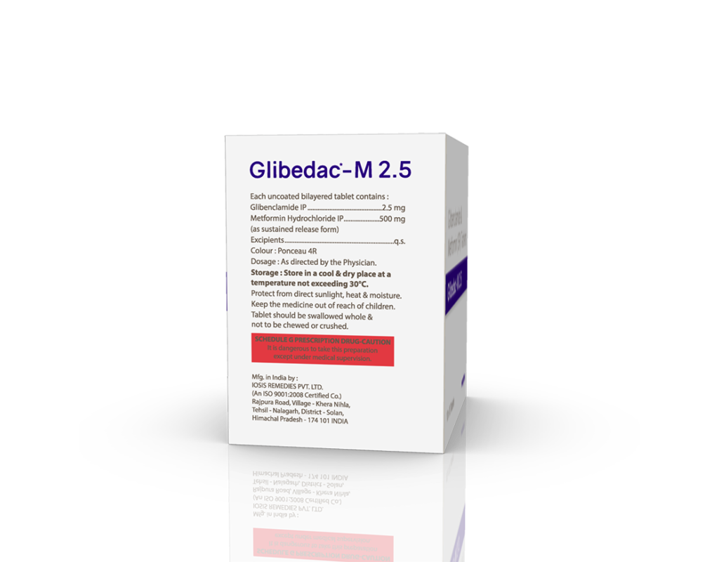 Glibedac-M 2.5 Tablets Glibenclamide 2.5 mg & Metformin 500 mg Pack : 1 x 10 Tablets Blister Pack Enquiry Categories: Cardio Diabetic Care, Pharma, Physician, Specialities Tag: Pharma Description Additional information Description Glibedac-M 2.5 Tablets Composition : Glibenclamide 2.5 mg & Metformin 500 mg Therapeutic Segment : Anti-Diabetic Packing : 1 x 10 Tablets (Blister Pack) Indications : Type-II Diabetes Mellitus Dosage : 1 tablet 1-2 times daily or as directed by Physician Product Enquiry Product Information Product DescriptionGlibedac-M 2.5 | 500 Tablets is used in the treatment of Type 2 diabetes mellitus. Type 2 diabetes mellitus is a chronic or life-long condition in which blood sugar or glucose levels rise more than normal. It occurs when the body does not produce enough insulin (metabolizes glucose), or if produced, it cannot function properly in the body. BenefitsTreatment of Type 2 Diabetes Mellitus. Direction For Use Take this medicine in the dose and duration as advised by your doctor. Swallow it as a whole. Do not chew, crush or break it. Mechanism of ActionGlibenclamide is a sulfonylurea which works by increasing the amount of insulin released by the pancreas in order to lower the blood glucose. Metformin is a biguanide. It works by lowering glucose production in the liver, delaying glucose absorption from intestines and increasing the body’s sensitivity to insulin. Also AvailableGlibedac 2.5 mg Tablets | Glibedac 5 mg Tablets | Glibedac-PM 5 Tablets | Glibedac-M 5 | 500 Tablets | Glibedac-M 5 | 850 Tablets Additional information Dosage Form Tablets Therapeutic Segment Anti-Diabetic ENQUIRY! Related Products Voglizest-GM1 Tablets (1 x 15) Voglibose 0.2 mg, Glimepiride 1 mg & Metformin 500 mg (SR) Pack : 1 x 15 Tablets (Blister Pack) ENQUIRY! Enquiry Vildasure-M 1000 Tablets Vildagliptin 50 mg & Metformin 1000 mg Pack : 1 x 10 Tablets Alu-Alu Pack ENQUIRY! Enquiry Glycirest-G1 Forte Tablets Glimepiride 1 mg & Metformin 1000 mg (SR) Pack : 1 X 10 Tablets Blister Pack ENQUIRY! Enquiry Tenezide-M 1000 Tablets Teneligliptin 20 mg & Metformin 1000 mg (SR) Pack : 1 x 10 Tablets Alu-Alu Pack ENQUIRY! Enquiry Related products Alfumac-D Tablets Alfuzosin 10 mg & Dutasteride 0.5 mg Pack : 1 x 10 Alu-Alu Pack ENQUIRY! Enquiry Aclopride-TA Tablets Aceclofenac 100 mg, Tramadol 37.5 mg & Paracetamol 325 mg Pack : 1 x 10 Tablets Blister Pack ENQUIRY! Enquiry Alrest 0.25 mg Tablets Clonazepam 0.25 mg Pack : 1 x 10 Blister Pack ENQUIRY! Enquiry Altum Tablet Albendazole 400 mg Pack : 1 Tab Blister Pack ENQUIRY! Enquiry