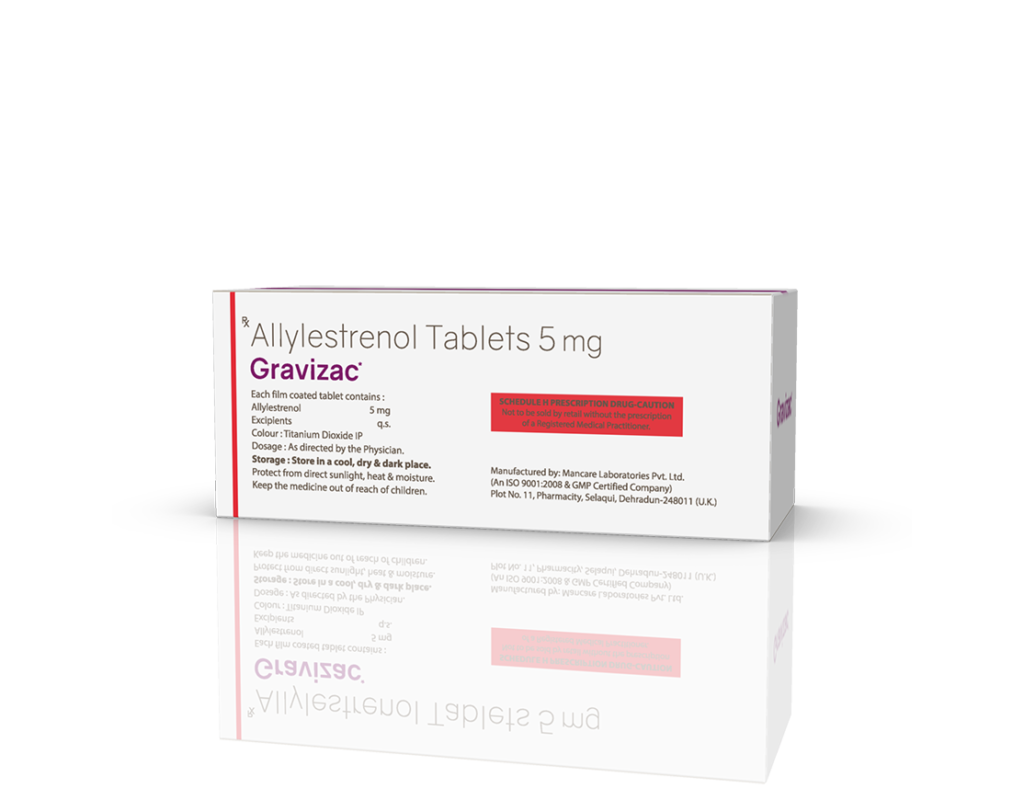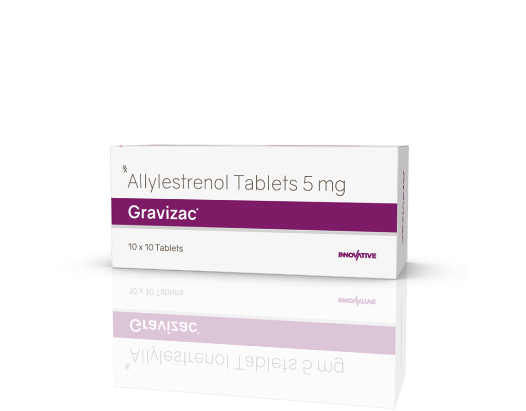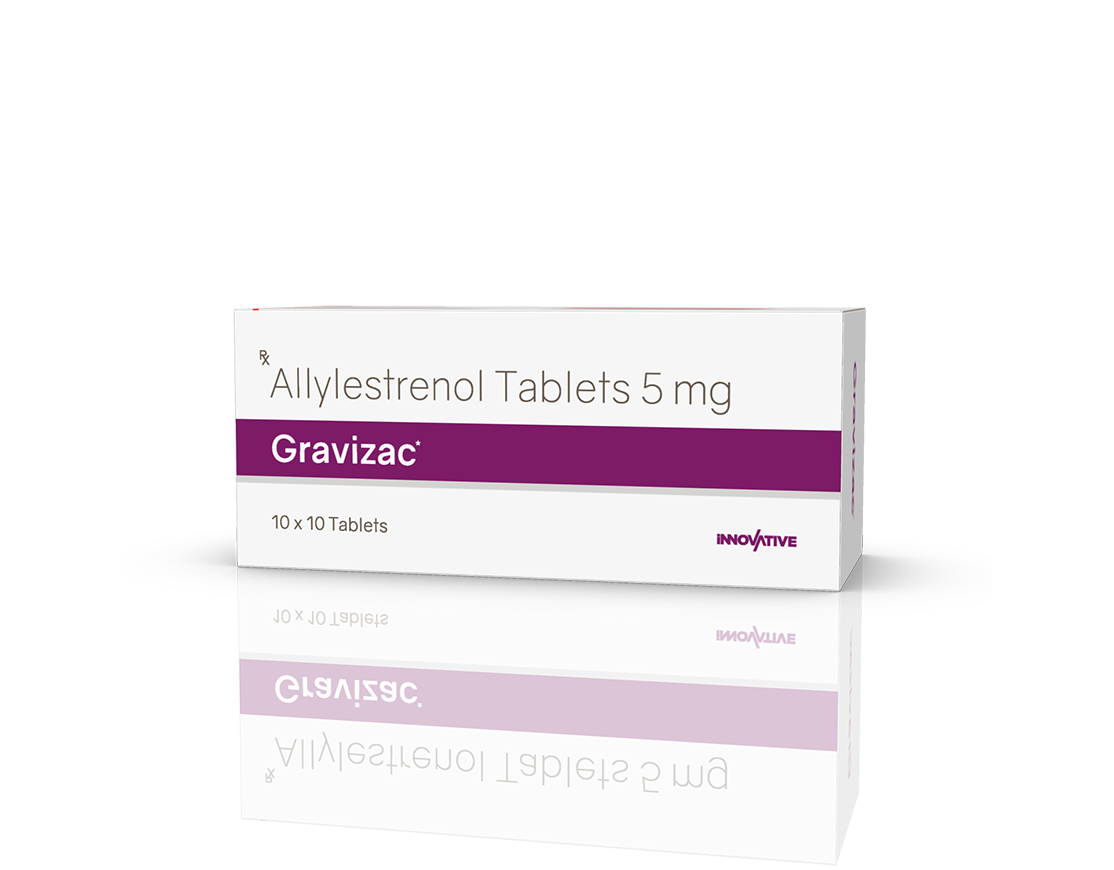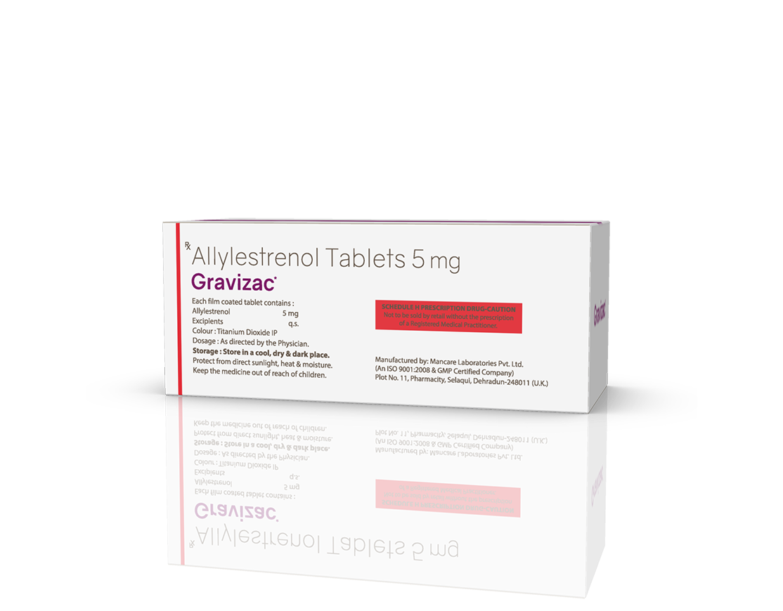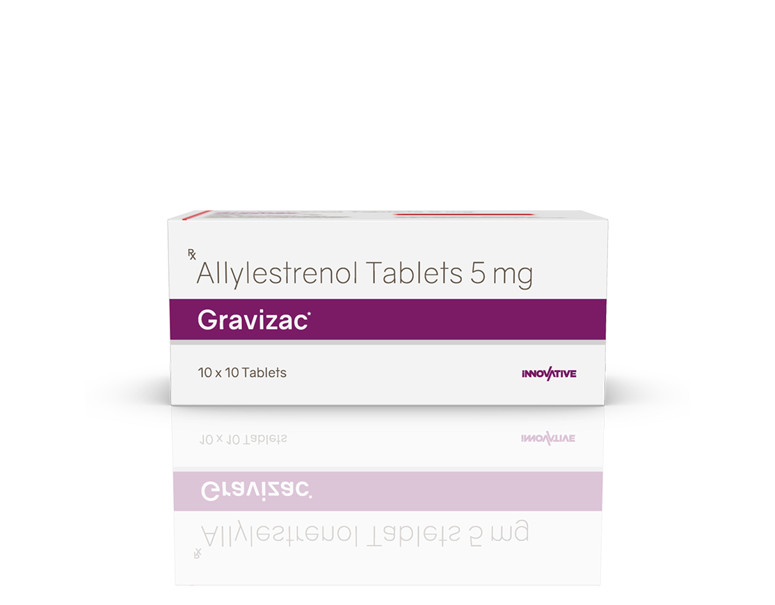 Gravizac 5 mg Tablets Allylestrenol 5 mg Pack : 1 x 10 Tablets Alu-Alu Pack Enquiry Categories: Gynaec Care, Pharma, Specialities Tag: Pharma Description Additional information Description Gravizac 5 mg Tablets Composition : Allylestrenol 5 mg Therapeutic Segment : Hormones Packing : 1 x 10 Tablets (Alu-Alu Pack) Indications : Premature Labour Threatened Abortion Dosage : 1 tablet 3 times daily for 5-7 days or as directed by Physician Product Enquiry Product Information Product DescriptionAllylestrenol is used to prevent premature labor and recurrent miscarriage. BenefitsHabitual Abortion Direction For Use Take this medicine in the dose and duration as advised by your doctor. Swallow it as a whole. Do not chew, crush or break it. Mechanism of ActionAllylestrenol is a progestin (female hormone). It helps in maintaining pregnancy by promoting the attachment of the embryo to lining of the womb and improving blood flow to the placenta. It also relaxes the uterus muscles thereby preventing premature labour. Also Available Additional information Dosage Form Tablets Therapeutic Segment Hormones ENQUIRY! Related Products Estralet 2 mg Tablets Estradiol Valerate 2 mg Tablets Pack : 1 x 10 Tablets Alu-Alu Pack ENQUIRY! Enquiry Isogest 200 Softgels Progesterone (Natural Micronised) 200 mg Pack : 1 x 10 Softgel Blister Pack in Mono Carton ENQUIRY! Enquiry Isogest 100 mg Injection Progesterone (Natural Micronised) 100 mg / ml Pack : 1 ml Clear Ring Ampoule with Syringe & 23 G Needle in Blister Pack with Mono Carton ENQUIRY! Enquiry Isogest-SR 300 mg Tablets Progesterone 300 mg (Natural Micronised) Sustained Release Tablets Pack : 1 x 10 Tablets Blister Pack in Mono Carton ENQUIRY! Enquiry Related products Aclopride Gel Aceclofenac, Linseed Oil, Methyl Salicylate, Menthol & Capsaicin Pack : 30 g Lami Tube In Mono Carton ENQUIRY! Enquiry Algra 100 mg Tablets Sildenafil Citrate 100 mg Pack : 1 x 4 Blister Pack in Mono Carton ENQUIRY! Enquiry Altum Plus Suspension Albendazole 200 mg & Ivermectin 1.5 mg / 5 ml Pack : 10 ml Bottle in Mono Carton ENQUIRY! Enquiry Altum Suspension Albendazole 200 mg / 5 ml Pack : 10 ml Bottle in Mono Carton ENQUIRY! Enquiry