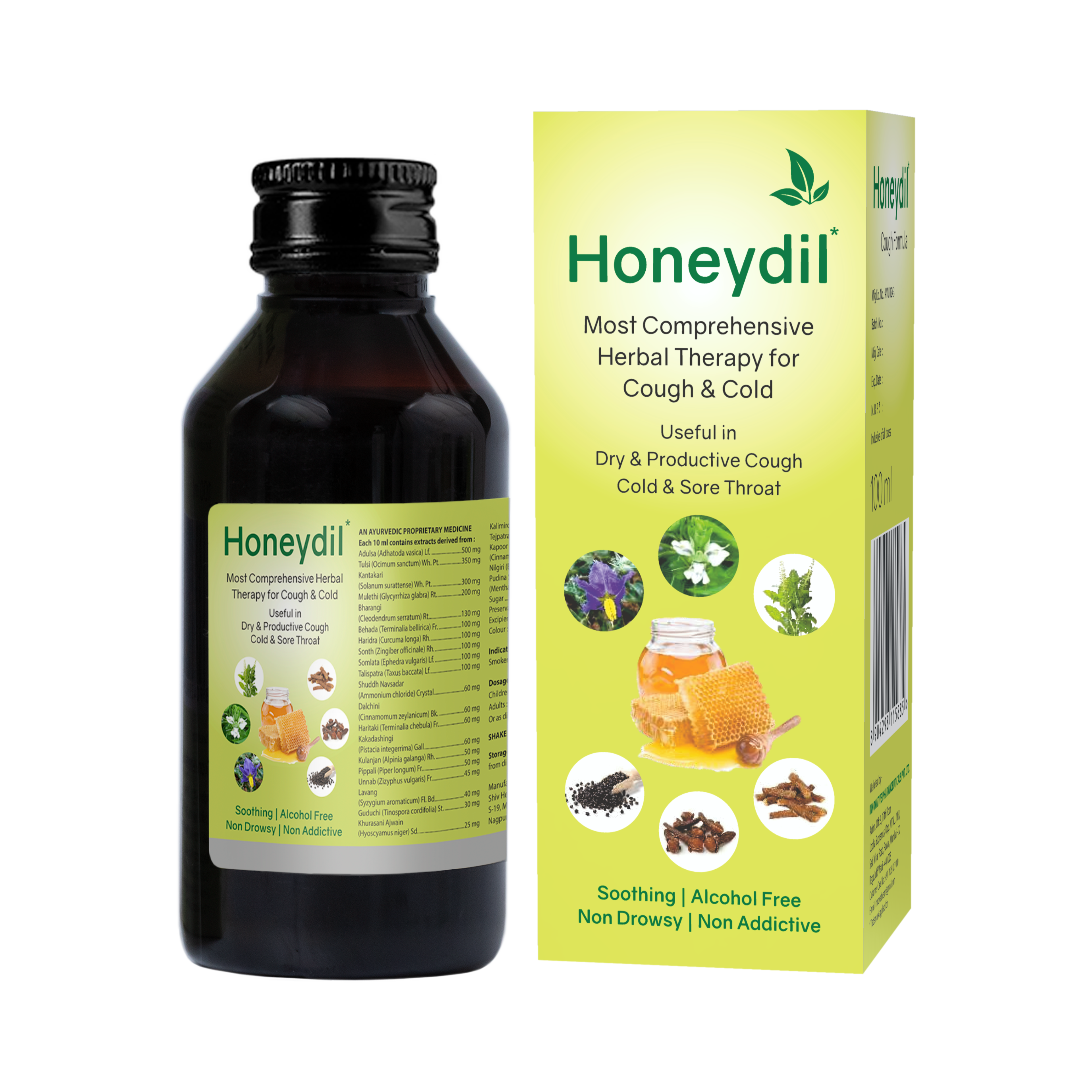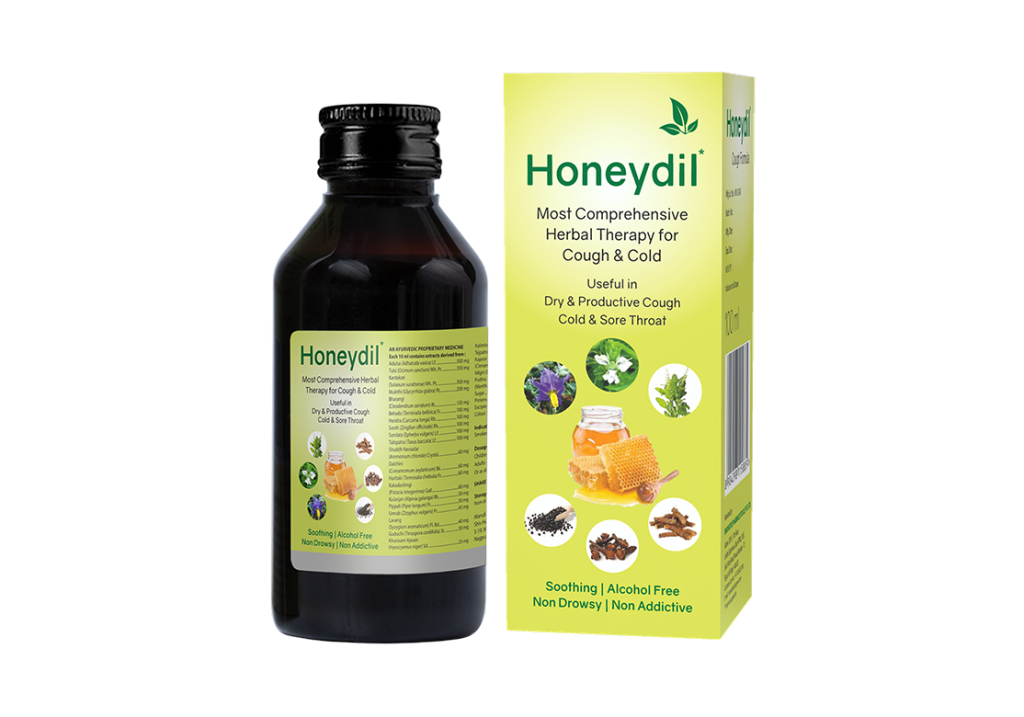 Honeydil Cough Syrup Enquiry Categories: Ayurvedic, Ayurvedic Care Description Additional information Description Honeydil Cough SyrupMost Comprehensive Herbal Therapy for Cough & Cold Therapeutic Segment : Cough & Cold Packing : 100 ml bottle in mono carton Enriched with goodness of Adulsa Lf. 500 mg, Tulsi Wh. Pt. 400 mg, Kantakari Wh. Pt. 300 mg, Mulethi Rt. 200 mg, Bharangi Rt. 125 mg, Behada Fr. 100 mg, Haridra Rh. 100 mg, Sonth Rh. 100 mg, Somlata Lf. 100 mg, Talispatra Lf. 100 mg, Shuddh Navsadar Crystal 50 mg DescriptionKey IngredientsBenefitsDirections for UseDescriptionAcute cough represents the most common illness evaluated in the outpatient settings. Available remedies for its management are generally allopathic combinations of antihistamines and decongestants that achieve antitussive activity, but often with unpleasant side effects prompting the need to explore safer and effective options. Ayurveda prescribes a number of herbs that are beneficial in alleviating cough and its symptoms. Honeydil Cough Syrup is an Ayurvedic herbal, cough syrup formula comprising with goodness of herbs such as Adulsa, Tulsi, Mulethi, Kantakari, Sonth and Pippali which has been reported to provide effective relief in cough without causing adverse effects like those associated with the use of antihistamines. Its contents such as Kalimirch and Haridra are also reported to possess additive benefits in relieving symptoms of acute nonproductive cough. This non-drowsy herbal supplement has amazing anti-inflammatory compounds that can relax membranes in the airways, which reduces coughing. Honeydil Cough Syrup is beneficial for common cough, sneezing, runny nose, nasal congestion & sore throat. It is also effective in acute & chronic bronchitis besides whooping & asthmatic cough. It ensures relief in respiratory tract infections, liquefies & expels viscous secretions in distressing & irritating cough. Also helpful in smoker’s cough & singer’s cough. It soothes respiratory passages improves sleep quality. Key Ingredients Adulsa Mulethi Tulsi BharangiBenefits Provides effective relief from cough without side effects Herbal syrup fortified with Tulsi, Adrak & other powerful scientifically proven herbs Fast relief against acute cough & throat irritations Soothes throat and relives cough Relieves the problems associated with allergic cough 100% Ayurvedic & safe Directions for Use Children: 5 ml thrice daily Adults: 10 ml thrice daily Or as directed by Physician Additional information Dosage Form Dry Syrup Therapeutic Segment Cough & Cold ENQUIRY! Related Products Orosoft Chewable Tablets ENQUIRY! Enquiry Calcipime-C Softgels Calcium 225 mg, Folic Acid 1.5 mg, Vitamin B6 3 mg, Methylcobalamin 1500 mcg & Vitamin D3 250 IU Packing : 1 x 10 Softgel Blister Pack in Mono Carton ENQUIRY! Enquiry Rabepep-DSR Capsules Rabeprazole Sodium 20 mg & Domperidone 30 mg (SR) Pack : 1 x 10 Capsules Alu-Alu Pack ENQUIRY! Enquiry Maxisoft Skin Lightening Soap 100 gm ENQUIRY! Enquiry Related products Redion-A Capsules ENQUIRY! Enquiry Arogya Tulsi Kanth Sudharak Vati ENQUIRY! Enquiry Bester Capsules 60 Caps ENQUIRY! Enquiry Arogya Tulsi Cough Syrup ENQUIRY! Enquiry