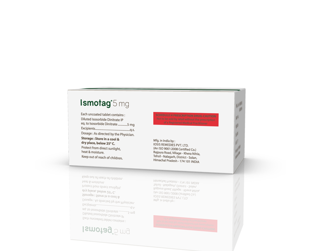 Ismotag 5 mg Tablets Isosorbide-Di nitrate 5 mg Pack : 1 x 10 Tablets Blister Pack Enquiry Categories: Cardio Diabetic Care, General Practitioner, Pharma, Physician, Specialities Tag: Pharma Description Additional information Description Ismotag 5 mg Tablets Composition : Isosorbide-Di nitrate 5 mg Therapeutic Segment : Antianginal Packing : 1 x 10 Tablets (Blister Pack) Indications : Chronic Stable Angina Pectoris Myocardial Infarction Coronary Heart Disease Dosage : Adult: 30 mg 2-3 times daily. Dose may range from 30-120 mg daily or as directed by Physician Also Available Ismotag 10 mg Tablets Additional information Dosage Form Tablets Therapeutic Segment Antianginal ENQUIRY! Related Products Ismolong 20 mg Tablets Isosorbide-5 Mono Nitrate 20 mg Pack : 1 x 10 Tablets Blister Pack ENQUIRY! Enquiry Nitromin-CR 6.4 mg Tablets Nitroglycerin 6.4 mg (CR) Pack : 1 x 10 Tablets Alu-Alu Pack ENQUIRY! Enquiry Labezide 100 mg Tablets Labetalol 100 mg Pack : 1 x 10 Tablets Alu-Alu Pack ENQUIRY! Enquiry Ivazest 7.5 mg Tablets Ivabradine 7.5 mg Pack : 1 x 10 Tablets Alu-Alu Pack ENQUIRY! Enquiry Related products Aclopride-PT8 Tablets Aceclofenac 100 mg, Paracetamol 325 mg & Thiocolchicoside 8 mg Pack : 1 x 10 Tablets Alu-Alu Pack ENQUIRY! Enquiry Aclopride-MR Tablets (Blister) Aceclofenac 100 mg, Paracetamol 325 mg & Chlorzoxazone 250 mg Pack : 1 x 10 Tablets Blister Pack ENQUIRY! Enquiry Altum Plus Tablet Albendazole 400 mg & Ivermectin 6 mg Tablet Pack : 1 x 10 Blister Pack in Mono Carton ENQUIRY! Enquiry Alfumac-ER 10 mg Tablets Alfuzosin 10 mg Extended Release Tablets Pack : 1 x 10 Alu-Alu Pack ENQUIRY! Enquiry