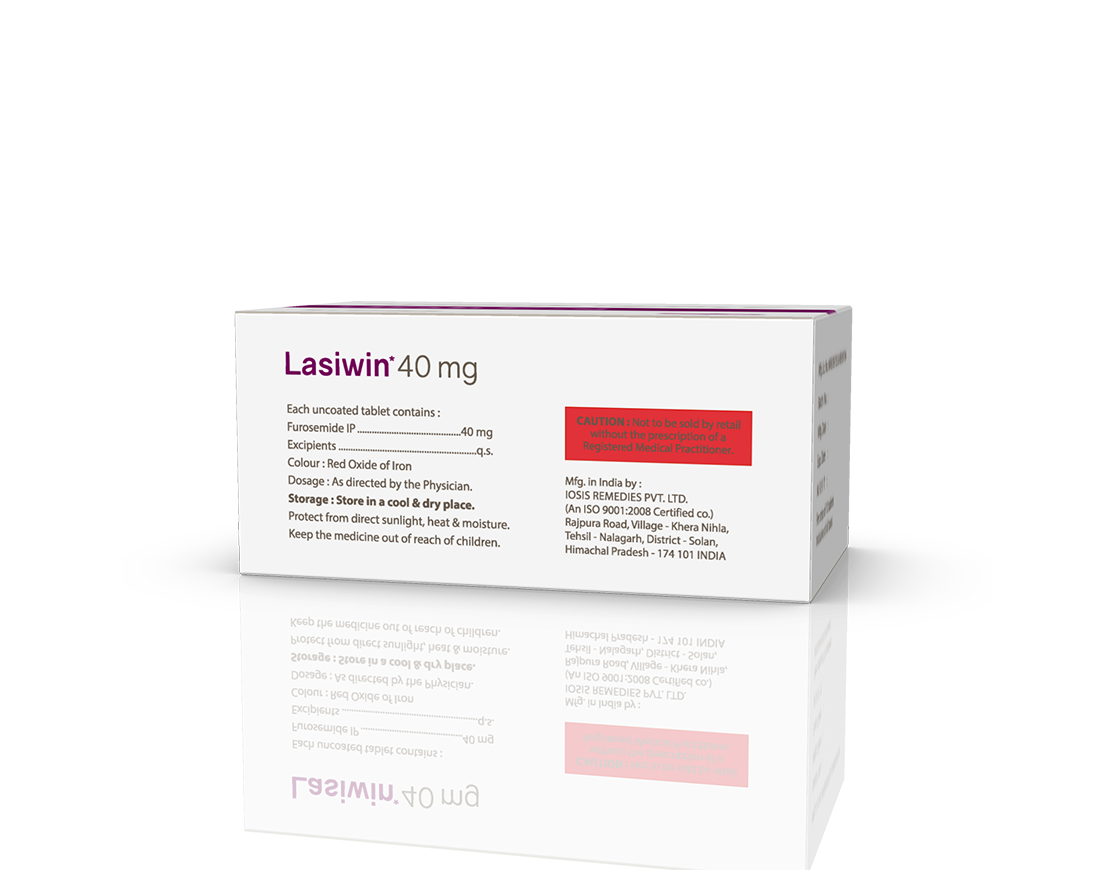 Lasiwin 40 mg Tablets Furosemide 40 mg Pack : 1 x 10 Tablets Blister Pack Enquiry Categories: General Practitioner, Pharma, Specialities, Surgical Care, Urology Care Tag: Pharma Description Additional information Description Lasiwin 40 mg Tablets Composition : Furosemide 40 mg Therapeutic Segment : Diuretic Packing : 1 x 10 Tablets (Blister Pack) Indications : Hypertension Pulmonary oedema Oliguria in acute or chronic renal failure Congestive heart failure Hepatic cirrhosis Nephrotic syndrome Dosage : 1 Tablet once daily or as directed by Physician Product Description : Belongs to a group of medicines called diuretics or water tablets. It is used to reduce the swelling (edema) caused by too much water in the body in people who have heart failure, liver or kidney disease. This medicine is also used to treat high blood pressure. Work Mechanism : Furosemide 40mg Tablet is a diuretic. It removes extra water and certain electrolytes from the body by increasing the amount of urine produced. Also Available Lasiwin Injection | Lasiwin-S 20 | 25 Tablets | Lasiwin-S 20 | 50 Tablets | Lasiwin-S 40 | 25 Tablets Additional information Dosage Form Tablets Therapeutic Segment Diuretic ENQUIRY! Related Products Chlorzen 12.5 mg Tablets Chlorthalidone 12.5 mg Pack : 1 x 10 Tablets Alu-Alu Pack ENQUIRY! Enquiry Lasiwin Injection Furosemide 40 mg / 2 ml Pack : 2 ml Amber Ring Ampoule in Blister Pack 5 x 2 ml & Outer Carton of 10 x 5 x 2 ml ENQUIRY! Enquiry Chlorodac 12.5 mg Tablets Hydrochlorothiazide 12.5 mg Pack : 1 x 10 Tablets Alu-Alu Pack ENQUIRY! Enquiry Torzest Forte Tablets Torsemide 20 mg & Spironolactone 50 mg Pack : 1 x 10 Tablets Alu-Alu Pack ENQUIRY! Enquiry Related products Aclopride-MR Tablets (Blister) Aceclofenac 100 mg, Paracetamol 325 mg & Chlorzoxazone 250 mg Pack : 1 x 10 Tablets Blister Pack ENQUIRY! Enquiry Alrest 0.25 mg Tablets Clonazepam 0.25 mg Pack : 1 x 10 Blister Pack ENQUIRY! Enquiry Aclopride-PT8 Tablets Aceclofenac 100 mg, Paracetamol 325 mg & Thiocolchicoside 8 mg Pack : 1 x 10 Tablets Alu-Alu Pack ENQUIRY! Enquiry Aclopride-TH8 Tablets Aceclofenac 100 mg & Thiocolchicoside 8 mg Pack : 1 x 10 Alu-Alu Pack ENQUIRY! Enquiry