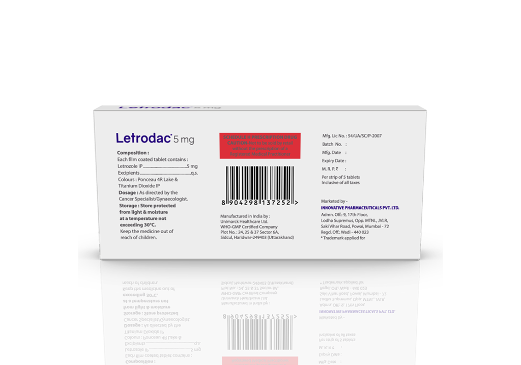 Letrodac 5 mg Tablets Letrozole 5 mg Pack : 1 x 5 Tablets (Blister Pack) Enquiry Categories: Gynaec Care, Pharma, Specialities Tag: Pharma Description Additional information Description Letrodac 5 mg Tablets Composition: Letrozole 5 mg Therapeutic Segment: Estrogen Inhibitors Packing : 1 x 5 Tablets (Blister Pack) Indications : Anovulatory women with PCOS To induce ovulation Dosage : As directed by Physician Product Enquiry Product Information Product DescriptionLetrozole is used in the treatment of breast cancer. Benefits Advanced or locally advanced breast cancer Adjuvant treatment in early breast cancer Direction For Use Take this medicine in the dose and duration as advised by your doctor. Swallow it as a whole. Do not chew, crush or break it. Mechanism of ActionLetrozole is an aromatase inhibitor. It works by decreasing the amount of estrogen (natural female hormone) produced in the body. This decrease in estrogen can slow down or stop the growth of some breast cancers that need estrogen to grow. Also Available Additional information Dosage Form Tablets Therapeutic Segment Estrogen Inhibitors ENQUIRY! Related Products Letrodac 2.5 mg Tablets Letrozole 2.5 mg Pack : 1 x 10 Tablets Alu-Alu Pack ENQUIRY! Enquiry Linagliptin 5 mg Linagliptin 5 mg Pack : 1 x 10 Tablets (Blister Pack) ENQUIRY! Enquiry Related products Algra Plus Tablets Sildenafil Citrate 50 mg & Dapoxetine 30 mg Pack : 1 x 4 Blister Pack in Mono Carton ENQUIRY! Enquiry Alfumac-D Tablets Alfuzosin 10 mg & Dutasteride 0.5 mg Pack : 1 x 10 Alu-Alu Pack ENQUIRY! Enquiry Aclopride-P Tablets (Blister) Aceclofenac 100 mg & Paracetamol 325 mg Pack : 1 x 10 Tablets Blister Pack ENQUIRY! Enquiry Alconix 500 mg Tablets Disulfiram 500 mg Pack : 1 x 4 Blister in Mono Carton ENQUIRY! Enquiry