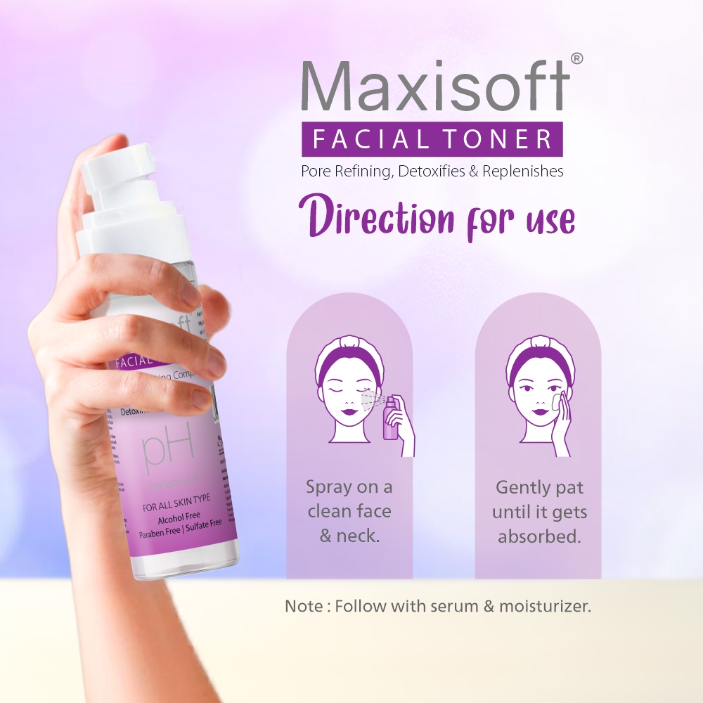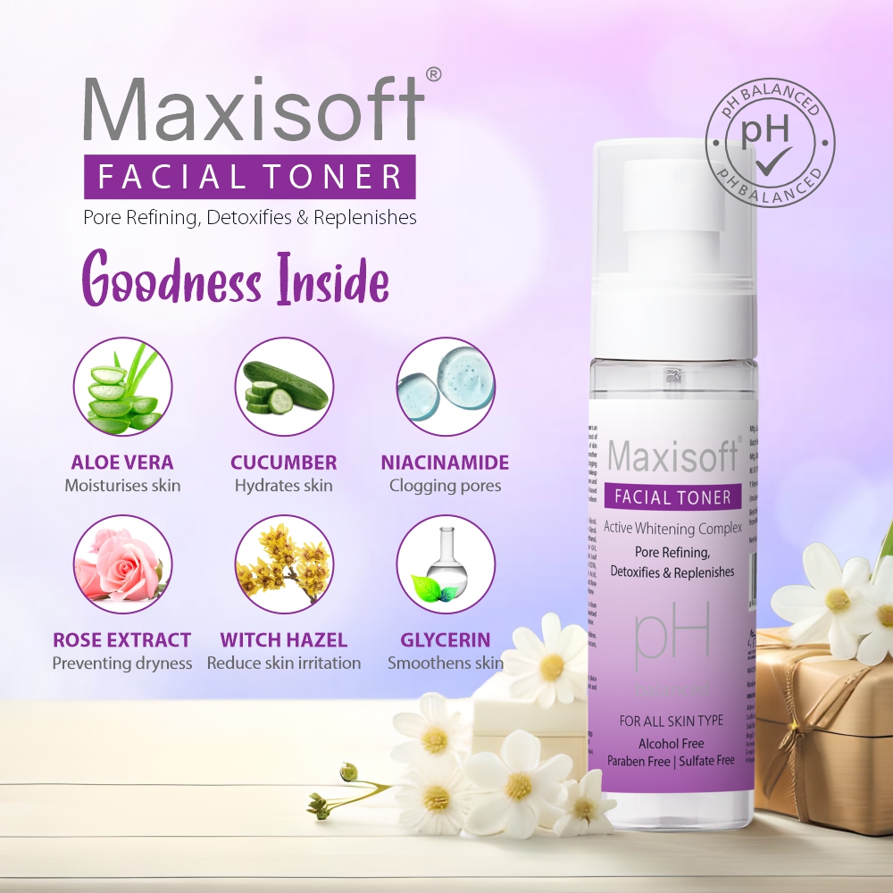 Maxisoft Facial Toner Enquiry Categories: Cosmetic, Cosmetics, Derma Care, Facial Care Description Additional information Description Maxisoft Facial TonerAchieve Smooth, Refined Skin with Hydration & Freshness Therapeutic Segment : Face Care Packing : 100 ml Spray Bottle Enriched with Sodium Hyaluronate, Niacinamide, Salicylic Acid, Green tea extract, Aloevera extract, Aloevera extract, Witch hazel, Rose extract & TEA DescriptionKey IngredientsBenefitsDirections for UseDescriptionTransform your skincare routine with MAXISOFT FACIAL TONER — a meticulously formulated solution designed to minimize pores, shydrate, and rejuvenate your skin. Enriched with active ingredients and botanical extracts, this toner is your go-to solution for smooth, balanced, and radiant skin. Whether your concern is oily skin, dryness, or uneven tone, this toner provides a comprehensive solution to enhance your skincare routine. Infused with Sodium Hyaluronate, Glycerine, this toner delivers intense hydration by penetrating deep into the skin layers, plumping and replenishing moisture levels for a soft, supple feel. The addition of Niacinamide works to refine the skin by minimizing the appearance of enlarged pores, regulating excess oil production, and brightening uneven skin tone. For those prone to clogged pores or blemishes, Salicylic Acid gently exfoliates and clears impurities, promoting a smoother and clearer complexion. MAXISOFT FACIAL TONER is enriched with soothing botanical extracts to care for your skin naturally. Aloe Vera provides calming hydration, helping to soothe irritation and redness, while Cucumber Extract offers a cooling effect, reducing puffiness and refreshing tired skin. Witch Hazel Extract, a natural astringent, tightens pores and reduces excess oil without drying out the skin. The luxurious touch of Rose Extract adds an extra layer of hydration and softness, leaving the skin feeling refreshed and revitalized. Packed with antioxidants from Green Tea Extract, the toner protects the skin from environmental stressors and reduces inflammation, making it ideal for sensitive or acne-prone skin. The formula is carefully balanced with Triethanolamine (TEA) to maintain the skin’s pH, ensuring it is gentle yet effective for daily use. A subtle, refreshing rose fragrance enhances the experience, leaving your skin lightly scented and feeling indulgent. MAXISOFT FACIAL TONER is Designed to everyday use, this toner prepares the skin for better absorption of Toners and moisturizers, making it an essential step in your skincare regimen. With consistent use, MAXISOFT FACIAL TONER visibly reduces the appearance of pores, balances oil production, and keeps your skin hydrated and healthy-looking. Suitable for all skin types, including oily, dry, combination, and sensitive skin, this toner addresses multiple skin concerns in one step. It’s lightweight, non-sticky, and absorbs quickly, ensuring that your skin feels comfortable and fresh after every application. Transform your skin with this multi-functional toner and enjoy a smooth, radiant, and poreless complexion every day. Perfect for use both morning and night, this toner is your go-to solution for achieving hydrated, refined, and glowing skin. Key Ingredients Niacinamide Salicylic Acid Glycerine Rose ExtractBenefits Starts repairing damaged skin and tightens it from the first application itself Minimizes the appearance of enlarged pores for smoother skin Boosts skin hydration, leaving it soft and moisturized Regulate oil production for a matte finish Removes dead skin cells, preventing clogged pores and breakouts Calms irritation and redness Maintain a balanced and healthy complexion Reduces the risk of acne and blackheads Firms the skin and tightens the pores Removes fine lines & age spots Shields skin from environmental stressors and free radicals Maintains skin pH balance Directions for Use Pour a small amount of MAXISOFT FACIAL TONER directly on the clean palms of your hands or Cotton pad and gently rub it on the perfectly cleansed face Pat it in place then Massage gently till it gets completely absorbed into your skin Apply more if needed Additional information Therapeutic Segment Face & Body Care Product Type Lotion ENQUIRY! Related Products Ketozest Plus Shampoo Ketoconazole 2% w/v & Cetrimide 0.5% w/v Pack : 100 ml Bottle in Mono Carton ENQUIRY! Enquiry Povibest Lotion 100 ml Povidone Iodine Solution 10% w/v Pack : 100 ml Bottle in Mono Carton ENQUIRY! Enquiry Rovalet-AC 10 | 75 Capsules Rosuvastatin 10 mg, Aspirin 75 mg (EC) & Clopidogrel 75 mg Pack : 1 x 10 Capsules Alu-Alu Pack ENQUIRY! Enquiry Doxofast-M Tablets Doxofylline 400 mg & Montelukast 10 mg Pack : 1 x 10 Tablets Alu-Alu Pack ENQUIRY! Enquiry Related products Defwin 24 mg Tablets Deflazacort 24 mg Pack : 1 x 10 Tablets Alu-Alu Pack ENQUIRY! Enquiry Ambroloc Respules Ambroxol Hydrochloride 15 mg / 2 ml Pack : 2 ml Respules ENQUIRY! Enquiry Hiflow Sachets L-Arginine 3 gm, Proanthocyanidins (Grape Seed) 75 mg, Folic Acid 100 mcg, Vitamin B6 2 mg & Zinc 10 mg / 4.2 gm Pack : 4.2 g Sachet ENQUIRY! Enquiry Ciproloc-TZ Tablets Ciprofloxacin 500 mg & Tinidazole 600 mg Pack : 1 x 10 Tablets Blister Pack ENQUIRY! Enquiry