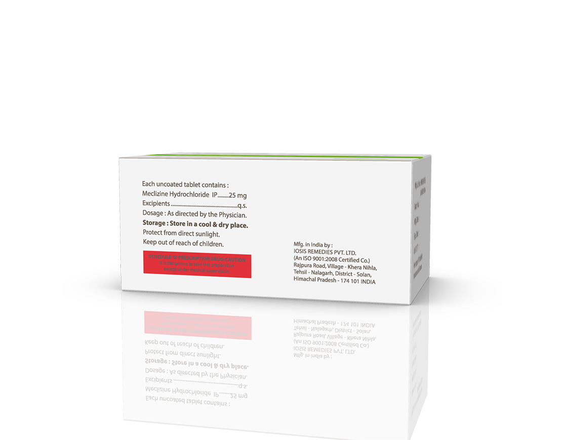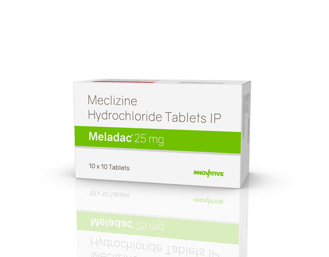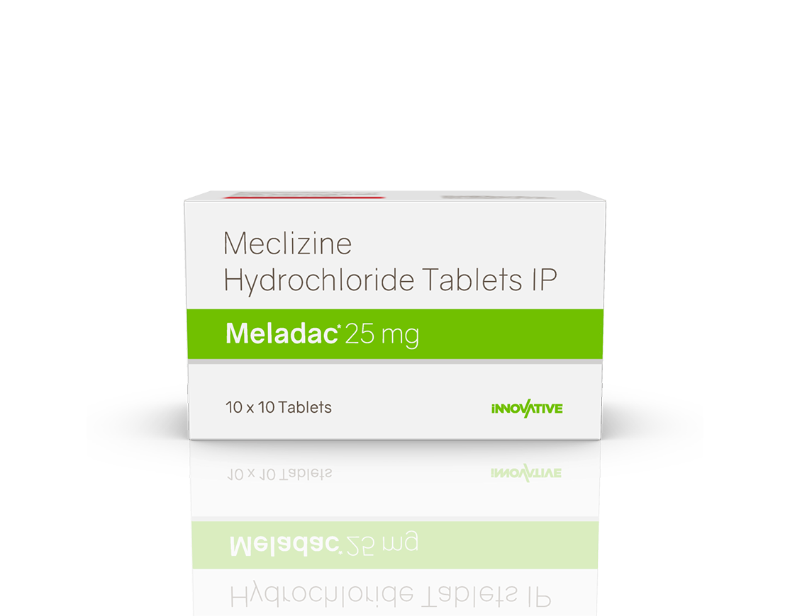 Meladac 25 mg Tablets Meclizine 25 mg Pack : 1 x 10 Tablets Blister Pack Enquiry Categories: Derma Care, ENT Care, Pharma, Physician, Specialities Tag: Pharma Description Additional information Description Meladac 25 mg Tablets Composition : Meclizine 25 mg Therapeutic Segment : Antihistamine | Anti-allergic Packing : 1 x 10 Tablets (Blister Pack) Indications : To prevent and treat Nausea, Vomiting Dosage : As directed by Physician Product Description : Meclizine is used in the treatment of motion sickness and vertigo. Product Enquiry Product Information Product DescriptionThis medication is classified as a ‘cough and cold preparation’ used to relieve symptoms of the common cold and allergies, such as sneezing, a runny or stuffy nose, fever, headache, body aches, congestion, and watery eyes. Common colds, usually caused by rhinoviruses, spread easily through the nose, mouth, or eyes, primarily through airborne droplets from sneezing, coughing, or talking. Benefits Dizziness caused by motion sickness Direction For Use Take this medicine in the dose and duration as advised by your doctor. Swallow it as a whole. Do not chew, crush or break it. Mechanism of ActionMeclizine is an antihistaminic medication. It works by blocking the action of histamine, a chemical in the brain that controls nausea, vomiting, and balance. It also makes you sleepy. Also Available Additional information Dosage Form Tablets Therapeutic Segment Antiallergic, Antihistamines ENQUIRY! Related Products Ketotide Syrup Ketotifen 1 mg / 5 ml Pack : 60 ml Bottle in Mono Carton ENQUIRY! Enquiry Lorpride 10 mg Tablets Loratadine 10 mg Pack : 1 X 10 Tablets Blister Pack ENQUIRY! Enquiry Cetzest 10 mg Tablets Cetirizine 10 mg Pack : 1 X 10 Tablets Blister Pack ENQUIRY! Enquiry Ketotide 1 mg Tablets Ketotifen 1 mg Pack : 1 x 10 Tablets Blister Pack ENQUIRY! Enquiry Related products Aclopride-PT Tablets Aceclofenac 100 mg, Paracetamol 325 mg & Thiocolchicoside 4 mg Pack : 1 x 10 Tablets Alu-Alu Pack ENQUIRY! Enquiry Aclopride-SP Tablets Aceclofenac 100 mg, Paracetamol 325 mg & Serratiopeptidase 15 mg Pack : 1 x 10 Blister Pack ENQUIRY! Enquiry Altum Tablet Albendazole 400 mg Pack : 1 Tab Blister Pack ENQUIRY! Enquiry Aclopride-TA Tablets Aceclofenac 100 mg, Tramadol 37.5 mg & Paracetamol 325 mg Pack : 1 x 10 Tablets Blister Pack ENQUIRY! Enquiry