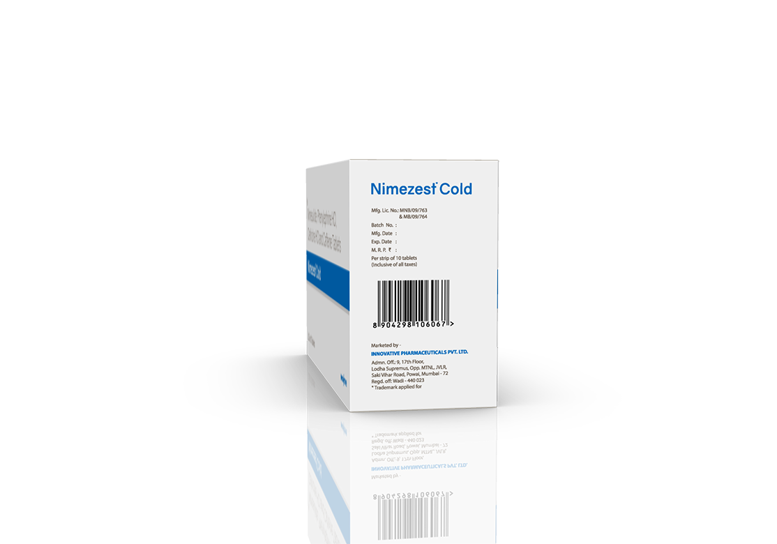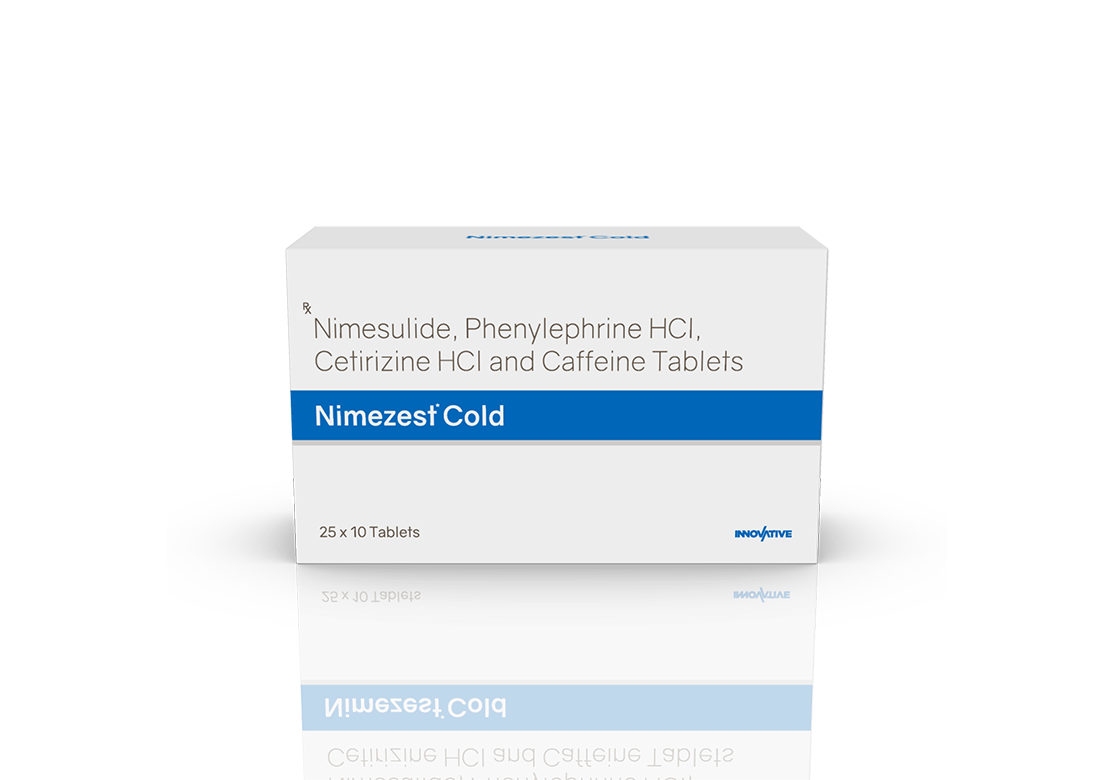 Nimezest Cold Tablets Nimesulide 100 mg, Phenylephrine 10 mg, Cetirizine 5 mg & Caffeine 30 mg Pack : 1 x 10 Tablets Blister Pack Enquiry Categories: General Practitioner, Pharma, Physician, Specialities Tag: Pharma Description Additional information Description Nimezest Cold Tablets Composition : Nimesulide 100 mg, Phenylephrine 10 mg, Cetirizine 5 mg & Caffeine 30 mg Therapeutic Segment : Anti-Cold Packing : 1 x 10 Tablets (Blister Pack) Indications : In Symptomatic Treatment of Fever Associated with – Allergic Rhinitis Common Cold Sneezing Sinusitis Dosage : 1 Tablet twice daily or as directed by Physician Product Enquiry Product Information Product DescriptionThis medication is classified as a ‘cough and cold preparation’ used to relieve symptoms of the common cold and allergies, such as sneezing, a runny or stuffy nose, fever, headache, body aches, congestion, and watery eyes. Common colds, usually caused by rhinoviruses, spread easily through the nose, mouth, or eyes, primarily through airborne droplets from sneezing, coughing, or talking. Benefits Allergic Rhinitis Sinusitis Demographic Common Cold Chronic Bronchitis Occular Allergy Direction For Use Take this medicine in the dose and duration as advised by your doctor. Swallow it as a whole. Do not chew, crush or break it. Mechanism of ActionNimesulide, Phenylephrine, Cetirizine and Caffeine which relieves aches and fever associated with cold. Nimesulide is a non-steroidal anti-inflammatory drug (NSAID). It works by blocking the release of certain chemical messengers that cause pain and inflammation (redness and swelling). Phenylephrine is a decongestant which narrows the small blood vessels providing relief from congestion or stuffiness in the nose. Cetirizine is an antiallergic which relieves allergy symptoms like runny nose, watery eyes and sneezing.Caffeine is a stimulant which decreases sleepiness caused by Cetirizine. Also AvailableNimezest-MD Tablets | Nimezest-P Tablets | Nimezest-CCF Tablets Additional information Dosage Form Tablets Therapeutic Segment Anti-Cold ENQUIRY! Related Products Mucobrex Cold Suspension Paracetamol 250 mg, Phenylephrine 5 mg, Chlorpheniramine Maleate 2 mg & Sodium Citrate 60 mg / 5 ml Pack : 60 ml Bottle with Measuring Cap in Mono Carton ENQUIRY! Enquiry Mucobrex Drops Paracetamol 125 mg, Phenylephrine 2.5 mg & Chlorpheniramine Maleate 1 mg / ml Pack : 15 ml Bottle with Dropper in Mono Carton ENQUIRY! Enquiry Mucobrex Cold Tablets Paracetamol 500 mg, Phenylepherine HCL 10 mg & Chlorpheniramine Maleate 2 mg Pack : 1 x 10 Tablets Blister Pack ENQUIRY! Enquiry Mucobrex Suspension Paracetamol 250 mg, Phenylephrine 5 mg, Chlorpheniramine Maleate 2 mg & Sodium Citrate 60 mg / 5 ml Pack : 60 ml Bottle with Measuring Cap in Mono Carton ENQUIRY! Enquiry Related products Alrest 0.25 mg Tablets Clonazepam 0.25 mg Pack : 1 x 10 Blister Pack ENQUIRY! Enquiry Ambroloc 30 mg Tablets Ambroxol 30 mg Pack : 1 x 10 Blister Pack ENQUIRY! Enquiry Alfumac-ER 10 mg Tablets Alfuzosin 10 mg Extended Release Tablets Pack : 1 x 10 Alu-Alu Pack ENQUIRY! Enquiry Aclopride-SP Tablets Aceclofenac 100 mg, Paracetamol 325 mg & Serratiopeptidase 15 mg Pack : 1 x 10 Blister Pack ENQUIRY! Enquiry