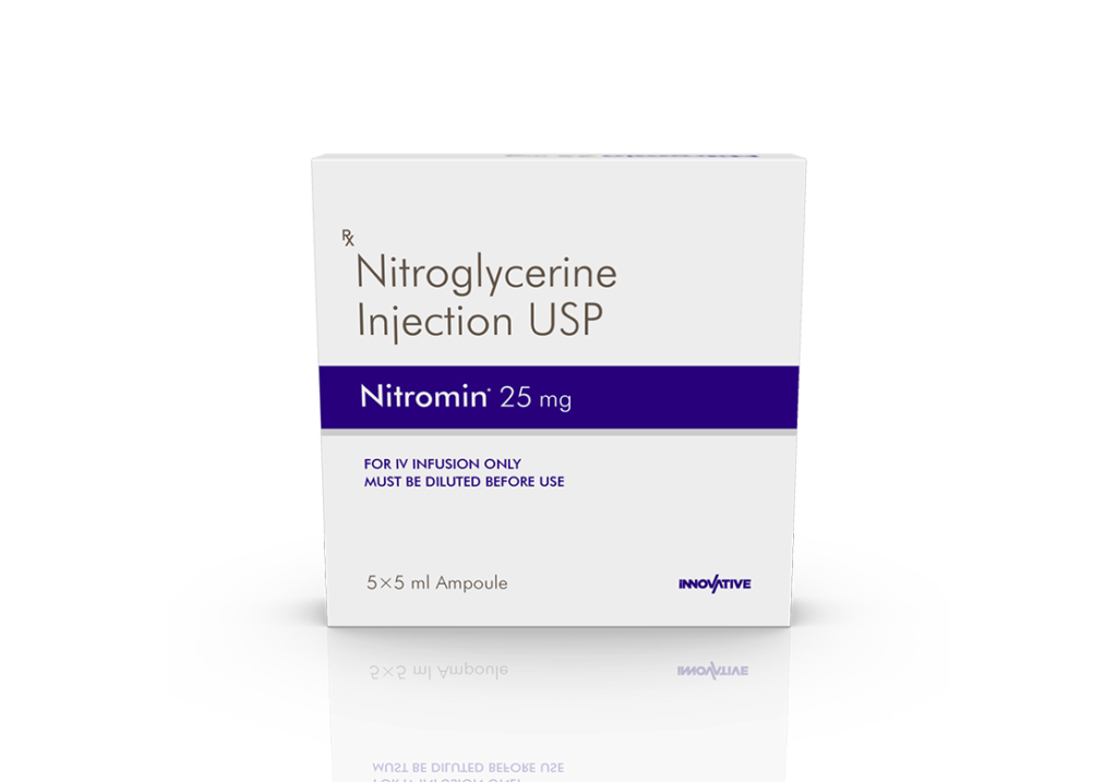 Nitromin 25 mg Injection Nitroglycerin 25 mg / 5 ml Pack : 5 ml Amber Ring Ampoule in Tray 5 x 5 ml with Outer Carton Enquiry Categories: Cardio Diabetic Care, Injectable Care, Pharma, Physician, Specialities Tag: Pharma Description Additional information Description Nitromin 25 mg Injection Composition : Nitroglycerin 25 mg / 5 ml Therapeutic Segment : Antianginal Packing : 5 ml Amber Ring Ampoule in Tray 5 x 5 ml with Outer Carton Indications : Angina Pectoris CHF Myocardial Infarction Coronary Heart Disease Dosage : Adult: Initially, 5-25 mcg/min, adjust according to response or as directed by Physician Product Description : Nitroglycerin is used in the treatment of Angina (heart-related chest pain). Work Mechanism : Nitroglycerin is a nitrate. It works by relaxing the blood vessels which decreases the oxygen demand of the heart and reduces its workload, thereby preventing/treating attacks of angina (chest pain). Also Available Nitromin-CR 2.6 mg Tablets | Nitromin-CR 6.4 mg Tablets Additional information Dosage Form Injectable Therapeutic Segment Antianginal ENQUIRY! Related Products Nicorest-ER 10 Tablets Nicorandil 10 mg Extended Release Tablets Pack : 1 x 10 Tablets Alu-Alu Pack ENQUIRY! Enquiry Flavedac 35 mg Tablets Trimetazidine 35 mg MR Tablets Pack : 1 x 10 Tablets Alu-Alu Pack ENQUIRY! Enquiry Ivazest 7.5 mg Tablets Ivabradine 7.5 mg Pack : 1 x 10 Tablets Alu-Alu Pack ENQUIRY! Enquiry Ismolong 10 mg Tablets Isosorbide-5 Mono Nitrate 10 mg Pack : 1 x 10 Tablets Blister Pack ENQUIRY! Enquiry Related products Aclopride-P Tablets (Blister) Aceclofenac 100 mg & Paracetamol 325 mg Pack : 1 x 10 Tablets Blister Pack ENQUIRY! Enquiry Aclopride-TH8 Tablets Aceclofenac 100 mg & Thiocolchicoside 8 mg Pack : 1 x 10 Alu-Alu Pack ENQUIRY! Enquiry Altum Tablet Albendazole 400 mg Pack : 1 Tab Blister Pack ENQUIRY! Enquiry Alrest 0.25 mg Tablets Clonazepam 0.25 mg Pack : 1 x 10 Blister Pack ENQUIRY! Enquiry