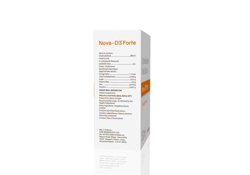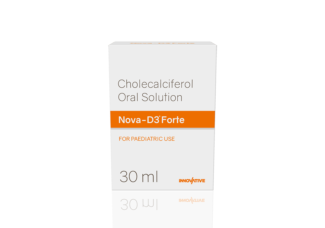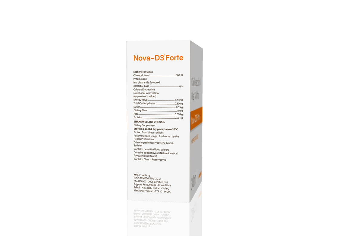 Nova-D3 Oral Drops Cholecalciferol 400 IU / ml Pack : 30 ml Bottle with Dropper in Mono Carton Enquiry Categories: General Practitioner, Paediatric Care, Pharma, Specialities Tag: Pharma Description Additional information Description Nova-D3 Oral Drops Composition: Cholecalciferol 400 IU / ml Therapeutic Segment: Multivitamins & Multiminerals Packing: 30 ml Bottle with Dropper in Mono Carton Indications : Vitamin D Deficiency Rickets & Hypocalcaemia Fractures Dosage : 0 to 12 months: 400 international units once daily, 1 to 18 years: 600 international units once daily or as directed by the Physician Product Enquiry Product Information Product DescriptionNova-D3 400 IU Oral Drops is a Vitamin that is used to regulate calcium and phosphate metabolism in children. This medicine is used to treat Vitamin D deficiency, and osteomalacia (softening or deforming of bones due to lack of calcium). Vitamin D deficiency occurs when your body has low Vitamin D levels and is caused due to inadequate nutrition, malabsorption, or lack of sunlight exposure.3 BenefitsFractures Direction For Use Shake the container well before each use. Measure the suggested dose of Nova-D3 400 IU Oral Drops and administer them to your child. It is advised to measure the quantity accurately with the help of a measuring cup syringe or dropper. Mechanism of ActionNova-D3 400 IU Oral Drops contains Vitamin-D3 (Cholecalciferol), a fat-soluble vitamin. It helps maintain blood calcium and phosphorus levels and the mineralization of bone Nova-D3 400 IU Oral Drops aids in calcium absorption enabling bone growth and repair. It further prevents cartilage degeneration. Nova-D3 400 IU Oral Drops is also used to maintain a healthy immune system. Also AvailableNova-D3 Forte Oral Drops | Nova-D3 Injection | Nova-D3 Max Softgels | Nova-D3 Sachet | Nova-D3 Softgels | Nova-D3 Tablets | Nova-D3 800 IU Oral Drops 30 ml | Nova-D3 Forte Oral Drops 15 ml Additional information Dosage Form Oral Drops Therapeutic Segment Multivitamins & Multiminerals ENQUIRY! Related Products Zinco-MN Syrup 300 ml (Nutra) Vitamins & Minerals Supplement with 10 Multivitamins, 8 Multiminerals, Calcium, Vitamin D3 & L-Lysine Pack : 300 ml Bottle with Measuring Cap in Mono Carton ENQUIRY! Enquiry Neurozest CD3 Softgels Composition : Methylcobalamin 1500 mcg, Alpha Lipoic Acid 100 mg, Benfotiamine 150 mg, Calcium Carbonate 500 mg, Chromium Picolinate 200 mcg, Folic Acid 1.5 mg , Inositol 100 mg, Pyridoxine Hydrochloride 3 mg & Vitamin D3 (Cholecalciferol) 1000 IU Packing : 1 x 10 Softgel (Blister Pack) in mono carton ENQUIRY! Enquiry Folizen Plus Tablets L-Methylfolate 1 mg, Methylcobalamin 1500 mcg, Pyridoxal-5 Phosphate 0.5 mg Pack: 1 x 10 Tablets (Alu-Alu Pack) ENQUIRY! Enquiry Zinco-MN Syrup 100 ml Vitamins & Minerals Supplement with 10 Multivitamins, 8 Multiminerals, Calcium, Vitamin D3 & L-Lysine Pack : 100 ml Bottle in Mono Carton ENQUIRY! Enquiry Related products Alfumac-ER 10 mg Tablets Alfuzosin 10 mg Extended Release Tablets Pack : 1 x 10 Alu-Alu Pack ENQUIRY! Enquiry Algra 100 mg Tablets Sildenafil Citrate 100 mg Pack : 1 x 4 Blister Pack in Mono Carton ENQUIRY! Enquiry Acetazone 250 mg Tablets Acetazolamide 250 mg Pack : 1 x 10 Blister Pack ENQUIRY! Enquiry Algra Plus Tablets Sildenafil Citrate 50 mg & Dapoxetine 30 mg Pack : 1 x 4 Blister Pack in Mono Carton ENQUIRY! Enquiry