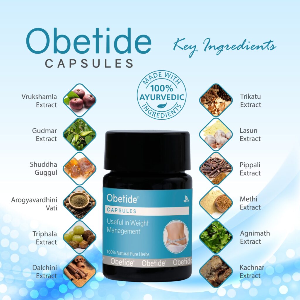 Obetide Capsules 10 Caps Enquiry Categories: Ayurvedic, Ayurvedic Care, Body Care Description Additional information Description Obetide Capsules 10 CapsObesity Care Therapeutic Segment : Anti-Obesity Packing : 10 Capsules in Jar with mono carton Ayurvedic formulation with goodness of Vrukshamla Extract Fr. 150 mg, Gudmar Extract Lf. 150 mg, Shuddha Guggul Gum 60 mg, Arogyavardhini Vati 60 mg, Triphala Extract 45 mg, Dalchini Extract Bk. 30 mg, Trikatu Extract 30 mg DescriptionKey IngredientsBenefitsDirections for UseDescriptionCarrying extra weight doesn’t affect just your clothing size or the number on the scale. Obesity in general affects your entire body be it your heart, joints or the blood flowing through your veins. You may be surprised to learn of the obesity-related health problems such as coronary heart disease, Type 2 Diabetes, Asthma, high cholesterol, Osteoarthritis, high Blood Pressure, sleep apnea, and certain types of Cancer. Moreover obesity brings with it an increased risk for a shorter life expectancy. For individuals whose weight exceeds twice their ideal body weight, the risk of an early death is doubled compared to non-obese individuals. Even beyond the issue of obesity-related health conditions, weight gain alone can lead to a condition known as “end-stage” obesity where, for the most part, no treatment options are available. Yet an early death is not the only potential consequence. Social, psychological and economic effects of obesity, however unfair, are real and can be especially devastating. Obetide Capsules presents the easiest way to burn away extra fat deposited in the body. Containing a powerful combination of herbs, the granules include some of the most time-tested natural ingredients in obesity control. It cleanses the fat-carrying channels, and causes the vital body fluids to flow normally. Modern science has proved the potency of most of the herbs contained in this formulation. They have no side-effects. Treatment with this will cleanse your body systems to prevent a relapse of obesity. Key Ingredients Gudmar Extract Trikatu Extract Lasun Extract Dalchini ExtractBenefits It contains natural ingredients like Triphala, Dalchini, Trikatu, Lasun, Pippali & Methi Suitable for both men & women Safe for long term use Contains no artificial additives & is 100% Vegetarian Made with 100% Ayurvedic Ingredients Directions for Use2 Capsules twice daily for 3-6 months preferably with warm water or as directed by the Physician Also Available Obetide Capsules 60 Caps Additional information Dosage Form Capsules Therapeutic Segment Anti-Obesity ENQUIRY! Related Products Maxisoft Skin Nourishing Baby Wash ENQUIRY! Enquiry Salicare 12% Ointment Salicylic Acid 12% w/w Pack : 30 g Lami Tube in Mono Carton ENQUIRY! Enquiry Dulocalm 40 mg Tablets Duloxetine 40 mg Pack : 1 x 10 Tablets Alu-Alu Pack ENQUIRY! Enquiry Jucee 1.5 gm injection Ascorbic Acid 1.5 gm Pack : 6 ml Vial Insert in Tray with Mono Carton ENQUIRY! Enquiry Related products Bester – Handmade Sheesham Wood Comb 15 FC ENQUIRY! Enquiry Ibzest Capsules ENQUIRY! Enquiry Arogya Aloe Vera Juice 1 litre ENQUIRY! Enquiry Redion-A Capsules ENQUIRY! Enquiry