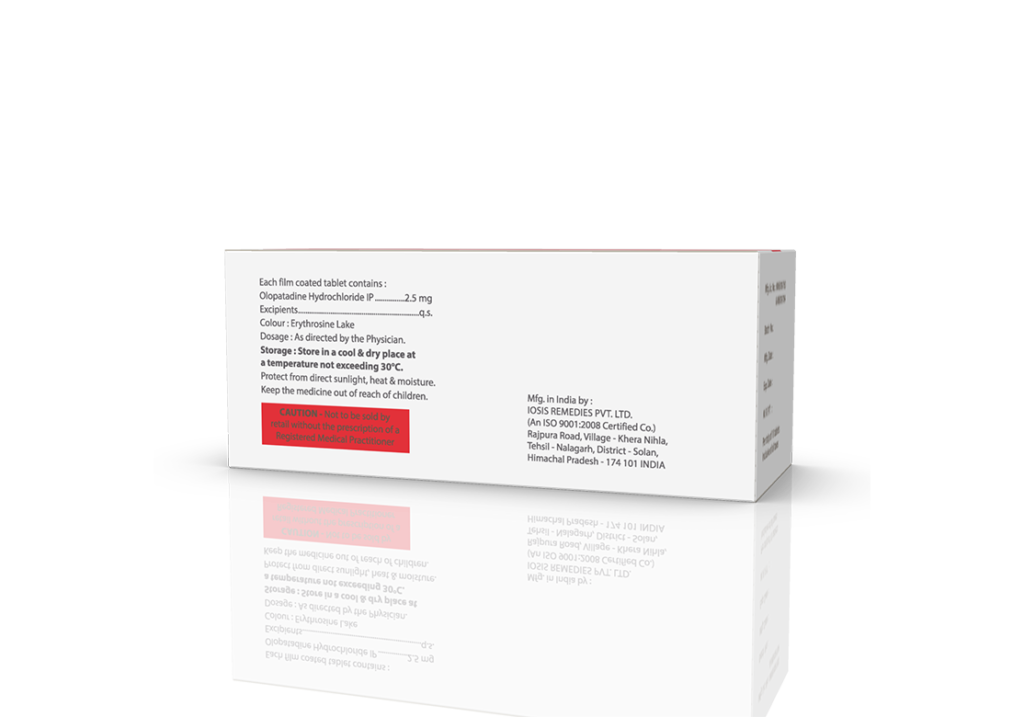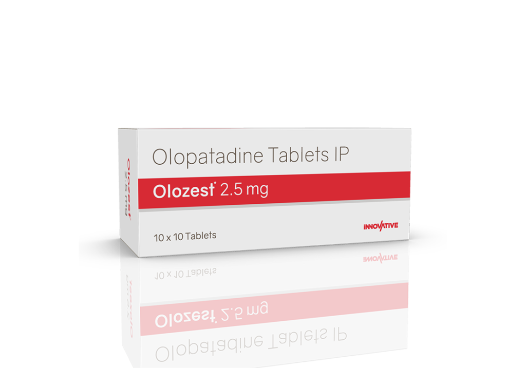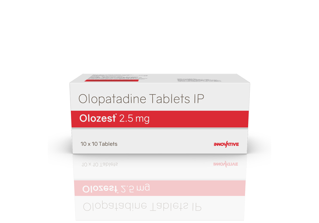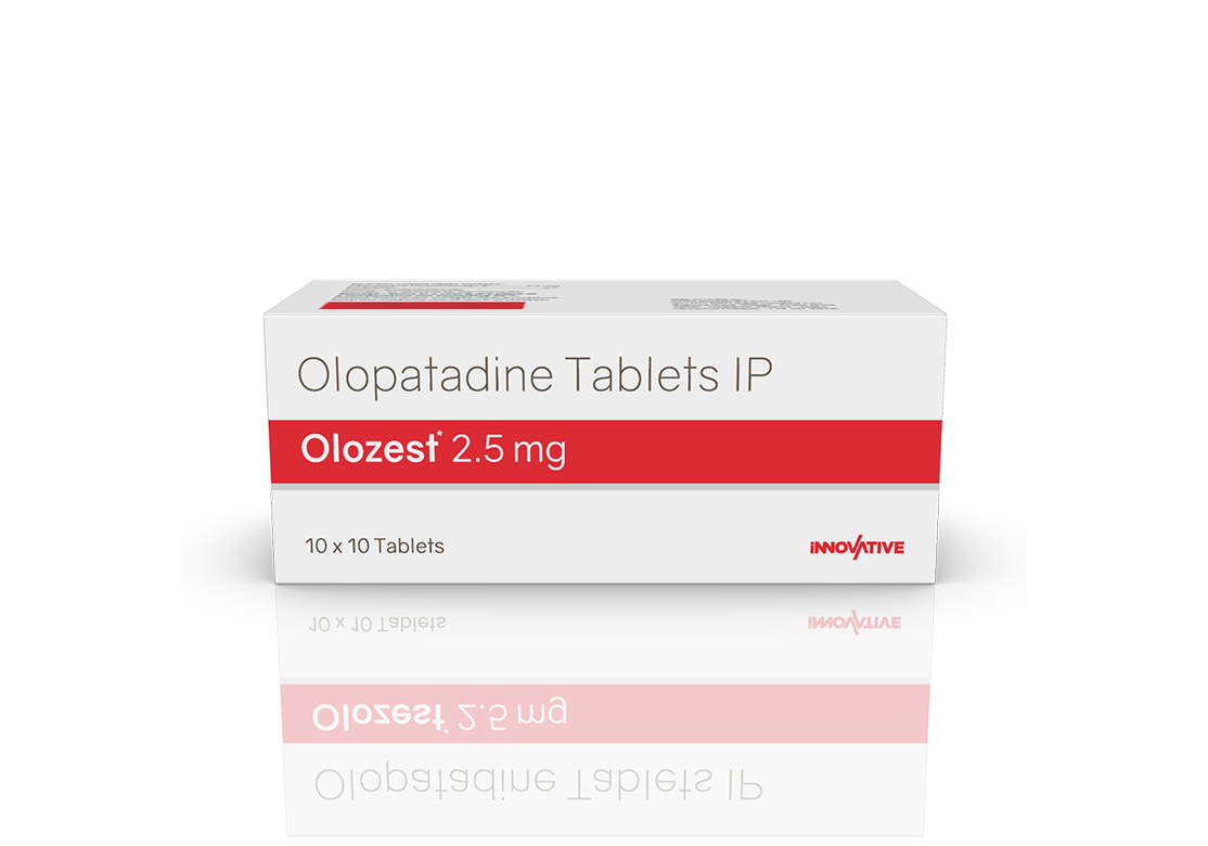Olozest 2.5 mg Tablets Olopatadine 2.5 mg Pack : 1 x 10 Tablets Alu-Alu Pack Enquiry Categories: Derma Care, ENT Care, Ophthalmic Care, Pharma, Specialities Tag: Pharma Description Additional information Description Olozest 2.5 mg Tablets Composition : Olopatadine 2.5 mg Therapeutic Segment : Antiallergic Packing : 1 x 10 Tablets (Alu-Alu Pack) Indications : Allergic eye disease Nasal allergy symptoms Allergic conditions Dosage : 1 Tablet twice daily or as directed by Physician Product Enquiry Product Information Product DescriptionOlozest 2.5mg Tablet belongs to a group of medicines called antihistamines. It is used in the treatment of various allergic conditions. It relieves symptoms like itching, swelling, and rashes. Benefits Sneezing and runny nose due to allergies Allergic skin conditions Direction For Use Take this medicine in the dose and duration as advised by your doctor. Swallow it as a whole. Do not chew, crush or break it. Mechanism of ActionOlozest 2.5 mg Tablets is an antihistaminic medication. It treats allergy symptoms such as itching, swelling, and rashes by blocking the effects of a chemical messenger (histamine) in the body. Also AvailableOlozest 5 mg Tablets |Olozest Eye Drops | Olozest-K Eye Drops Additional information Dosage Form Tablets Therapeutic Segment Antiallergic ENQUIRY! Related Products Bilapride-M Tablets Bilastine 20 mg & Montelukast 10 mg Bilayered Tablets Pack : 1 x 10 Tablet Alu-Alu Pack ENQUIRY! Enquiry Ketotide 1 mg Tablets Ketotifen 1 mg Pack : 1 x 10 Tablets Blister Pack ENQUIRY! Enquiry Lorpride 10 mg Tablets Loratadine 10 mg Pack : 1 X 10 Tablets Blister Pack ENQUIRY! Enquiry Mucobrex-LC Tablets Montelukast 10 mg & Levocetirizine 5 mg Pack : 1 x 10 Tablets Alu-Alu Pack ENQUIRY! Enquiry Related products Calcipime 500 mg Tablets Calcium Supplement with Vitamin D3 & Multiminerals Pack : 1 X 15 Tablets Blister Pack ENQUIRY! Enquiry Altum Plus Suspension Albendazole 200 mg & Ivermectin 1.5 mg / 5 ml Pack : 10 ml Bottle in Mono Carton ENQUIRY! Enquiry Ambroloc 30 mg Tablets Ambroxol 30 mg Pack : 1 x 10 Blister Pack ENQUIRY! Enquiry Altum Tablet Albendazole 400 mg Pack : 1 Tab Blister Pack ENQUIRY! Enquiry
