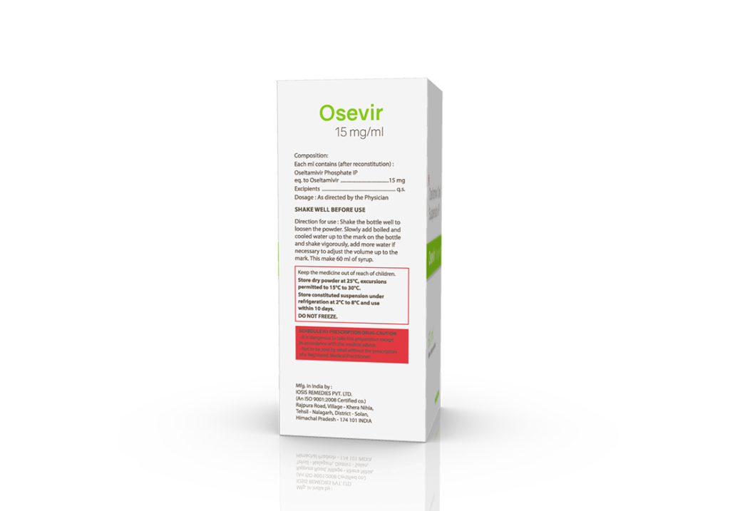 Osevir 15 mg Suspension (60 ml) Oseltamivir 15 mg / ml Pack : 60 ml Bottle in Mono Carton Enquiry Categories: Paediatric Care, Pharma, Specialities Tag: Pharma Description Additional information Description Osevir Suspension Composition : Oseltamivir 15 mg / ml Therapeutic Segment : Antiviral Packing : 60 ml Bottle in Mono Carton Indications : To treat symptoms caused by the flu virus (Influenza-A, Influenza-B) Dosage : 75 mg bid- for 5 days-for the treatment of influenza A & B or as directed by Physician Product Enquiry Product Information Product DescriptionOseltamivir is commonly used for the treatment of the flu (influenza A and B), but only within the first two days of having flu symptoms. Oseltamivir is also used for the prevention of the flu. The flu, short for influenza, is caused by influenza viruses that infect parts of the body, leading to symptoms such as fever, cough, sore throat, body aches, and fatigue. BenefitsTo treat symptoms caused by the flu virus (Influenza-A, Influenza-B) such as stuffy nose, cough, sore throat, fever/chills, aches, tiredness Direction For Use Take this medicine in the dose and duration as advised by your doctor. Check the label for directions before use. Measure it with a measuring cup and take it by mouth. Shake well before use. Mechanism of ActionOseltamivir is an antiviral neuraminidase inhibitor used for the treatment and prophylaxis of infection with influenza viruses A (including pandemic H1N1) and B. Oseltamivir exerts its antiviral activity by inhibiting the activity of the viral neuraminidase enzyme found on the surface of the virus, which prevents budding from the host cell, viral replication, and infectivity. Also AvailableOsevir 30 mg Capsules | Osevir 45 mg Capsules | Osevir 75 mg Capsules | Osevir 15 mg Suspension (30 ml) Additional information Dosage Form Suspension Therapeutic Segment Antiviral ENQUIRY! Related Products Osevir 30 mg Capsules Oseltamivir 30 mg Pack : 1 x 10 Capsules Alu-Alu Pack ENQUIRY! Enquiry Osevir 45 mg Capsules Oseltamivir 45 mg Pack : 1 x 10 Capsules Alu-Alu Pack ENQUIRY! Enquiry Entedac 0.5 mg Tablets Entecavir 0.5 mg Tablets Pack : 1 x 10 Tablets Alu-Alu Pack ENQUIRY! Enquiry Famdac 500 mg Tablets Famciclovir 500 mg Pack : 1 x 3 Tablets Blister Pack ENQUIRY! Enquiry Related products Altum Plus Tablet Albendazole 400 mg & Ivermectin 6 mg Tablet Pack : 1 x 10 Blister Pack in Mono Carton ENQUIRY! Enquiry Aclopride Gel Aceclofenac, Linseed Oil, Methyl Salicylate, Menthol & Capsaicin Pack : 30 g Lami Tube In Mono Carton ENQUIRY! Enquiry Aclopride-PT8 Tablets Aceclofenac 100 mg, Paracetamol 325 mg & Thiocolchicoside 8 mg Pack : 1 x 10 Tablets Alu-Alu Pack ENQUIRY! Enquiry Alfumac-ER 10 mg Tablets Alfuzosin 10 mg Extended Release Tablets Pack : 1 x 10 Alu-Alu Pack ENQUIRY! Enquiry