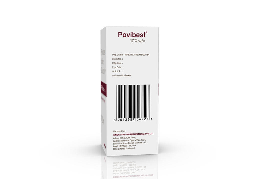 Povibest Lotion 100 ml Povidone Iodine Solution 10% w/v Pack : 100 ml Bottle in Mono Carton Enquiry Categories: Gastro Care, General Practitioner, Gynaec Care, Nephrologist, Orthopaedic Care, Pharma, Specialities, Surgical Care, Urology Care Tag: Pharma Description Additional information Description Povibest Lotion 100 ml Composition : Povidone Iodine Solution 10% w/v Therapeutic Segment : Topical Antiseptic Packing : 100 ml Bottle in Mono Carton Indications : Treatment and prevention of Wound infection Dosage : Apply a small amount to the affected area 2-3 times daily or as directed by Physician Product Enquiry Product Information Product DescriptionPovibest Lotion is an antiseptic and disinfectant agent. It is used for the treatment and prevention of infections in wounds and cuts. It kills the harmful microbes and controls their growth, thereby preventing infections in the affected area. BenefitsTreatment and prevention of Wound infection Direction For Use Apply a thin layer of cream to the affected area as directed by a doctor. Wash your hands before and after application. Avoid contact with eyes, nose, and mouth. Mechanism of ActionPovibest Lotion is an antiseptic applied on skin, which is infected or is likely to get infected. It works by slowly releasing iodine which kills or prevents the growth of infectious microorganisms. Also AvailablePovibest Gargle | Povibest Lotion 50 ml | Povibest Ointment | Povibest Powder | Povibest-M Ointment Additional information Dosage Form Lotion Therapeutic Segment Topical Antiseptic ENQUIRY! Related Products Borowin Antiseptic All Purpose Cream ENQUIRY! Enquiry Povibest Ointment Povidone Iodine 10% w/w Pack : 15 g Lami Tube in Mono Carton ENQUIRY! Enquiry Povibest Powder Povidone Iodine 5% w/w Pack : 10 g ENQUIRY! Enquiry Silvebet Nano Cream Silver Nitrate 0.2% & Chlorhexidine Gluconate 0.2% w/w Pack : 15 g Lami Tube in Mono Carton ENQUIRY! Enquiry Related products Aclopride-PT8 Tablets Aceclofenac 100 mg, Paracetamol 325 mg & Thiocolchicoside 8 mg Pack : 1 x 10 Tablets Alu-Alu Pack ENQUIRY! Enquiry Aclopride Gel Aceclofenac, Linseed Oil, Methyl Salicylate, Menthol & Capsaicin Pack : 30 g Lami Tube In Mono Carton ENQUIRY! Enquiry Ambroloc 30 mg Tablets Ambroxol 30 mg Pack : 1 x 10 Blister Pack ENQUIRY! Enquiry Aclopride-TH8 Tablets Aceclofenac 100 mg & Thiocolchicoside 8 mg Pack : 1 x 10 Alu-Alu Pack ENQUIRY! Enquiry