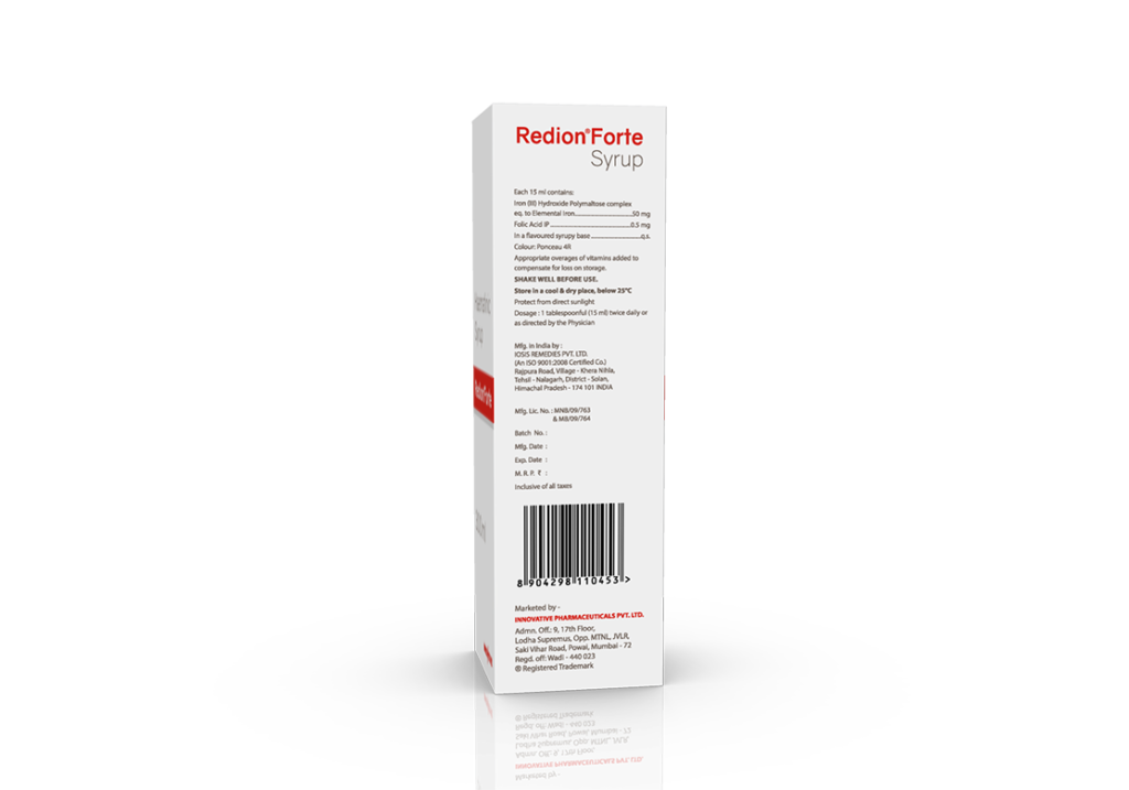 Redion Forte Syrup 300 ml Iron 50 mg & Folic Acid 0.5 mg / 15 ml Pack : 300 ml Bottle with Measuring Cap in Mono Carton Enquiry Categories: General Practitioner, Gynaec Care, Pharma, Physician, Specialities, Surgical Care Tag: Nutraceutical Description Additional information Description Redion Forte Syrup 300 ml Composition : Iron 50 mg & Folic Acid 0.5 mg / 15 ml Therapeutic Segment : Iron Supplements Packing : 300 ml Bottle with Measuring Cap in Mono Carton Indications : Anaemia in pregnancy Anaemia in post-operative & post traumatic conditions Dosage : 1-2 tsf twice daily or as directed by Physician Product Enquiry Product Information Product DescriptionRedion Forte Syrup is an iron and folic acid supplement used to treat iron deficiency anemia and megaloblastic anemia. Benefits Lack of appetite Dimorphic anaemia due to deficiency of Iron & Folic Acid Direction For Use Shake well before use & as directed by your physician. Do not exceed the stated daily recommended dosages. Mechanism of ActionRedion Forte Syrup is an iron supplement used to treat iron deficiency anemia and related conditions. The mechanism of action involves the iron and folic acid in the syrup working together to address these deficiencies. Iron is essential for the production of hemoglobin, a protein in red blood cells that carries oxygen throughout the body. Folic acid is crucial for cell growth and development, particularly during periods of rapid growth like infancy, adolescence, and pregnancy. Together, they help replenish the body’s iron and folate stores, which are necessary for healthy red blood cell formation and overall well-being. Also AvailableRedion 100 mg Injection | Redion Drops | Redion Softgels | Redion Syrup | Redion Tablets | Redion-XT Drops | Redion-XT Softgels | Redion-XT Syrup | Redion-XT Tablets | Redion-Z Syrup 300 ml | Redion-Z Tablets Additional information Dosage Form Syrup Therapeutic Segment Iron Supplements ENQUIRY! Related Products Broncolite Syrup 60 ml Terbutaline 2.5 mg, Bromhexine 8 mg, Guaiphenesin 100 mg & Menthol 5 mg / 10 ml Pack : 60 ml Bottle with Measuring Cap in Mono Carton ENQUIRY! Enquiry Ursobest Suspension Ursodeoxycholic Acid 125 mg / 5 ml Pack : 100 ml Bottle with Measuring Cap in Mono Carton ENQUIRY! Enquiry Laxozest Granules Lactilol Monohdrate 10 gm & Ispaghula (Psyllium) Husk 3.5 gm Pack : 90 g Jar ENQUIRY! Enquiry Oviva-CD Tablets Nutritional Supplements Pack : 1 x 10 Tablets Alu-Alu Pack ENQUIRY! Enquiry Related products Aclopride-TA Tablets Aceclofenac 100 mg, Tramadol 37.5 mg & Paracetamol 325 mg Pack : 1 x 10 Tablets Blister Pack ENQUIRY! Enquiry Aclopride-D Tablets Aceclofenac 100 mg & Drotaverine 80 mg Pack : 1 x 10 Tablets Blister Pack ENQUIRY! Enquiry Acetazone 250 mg Tablets Acetazolamide 250 mg Pack : 1 x 10 Blister Pack ENQUIRY! Enquiry Algra 100 mg Tablets Sildenafil Citrate 100 mg Pack : 1 x 4 Blister Pack in Mono Carton ENQUIRY! Enquiry