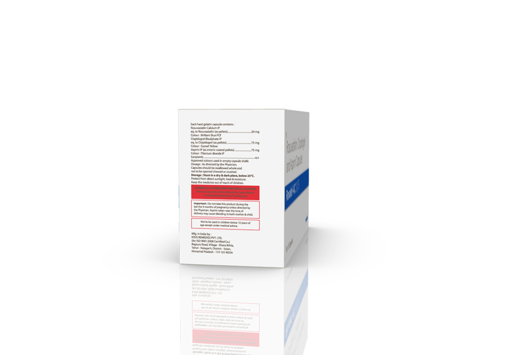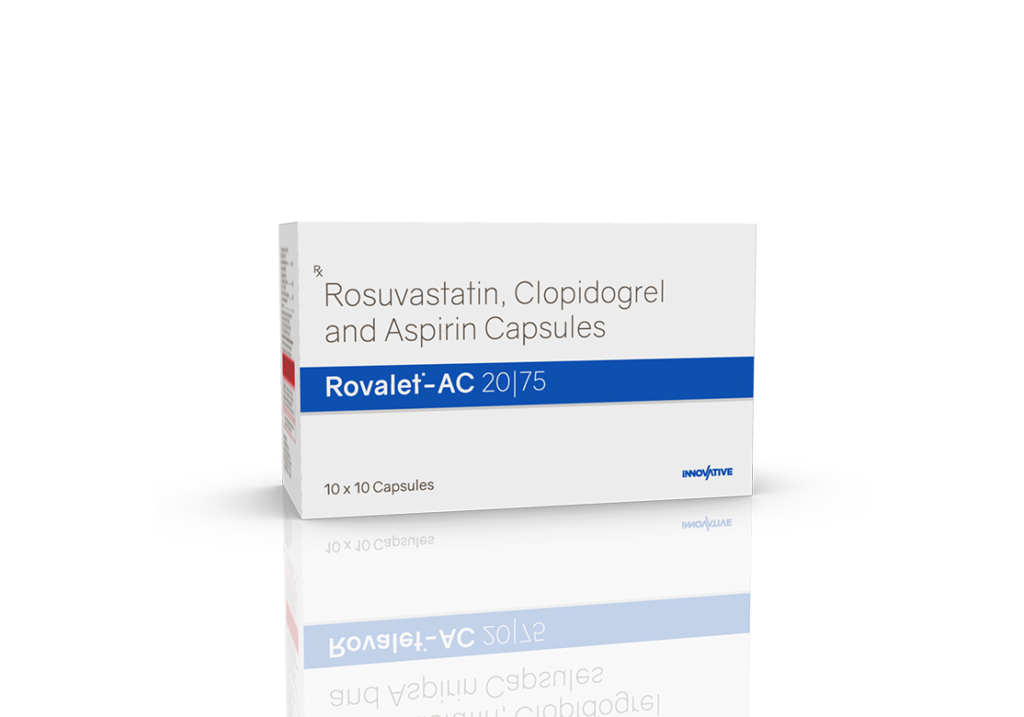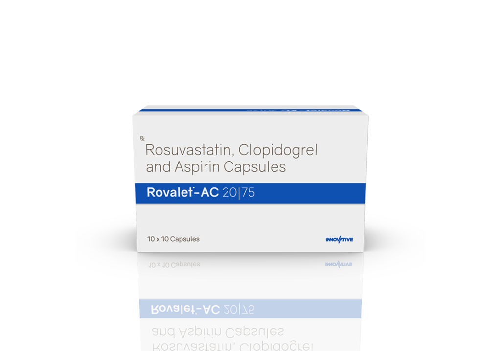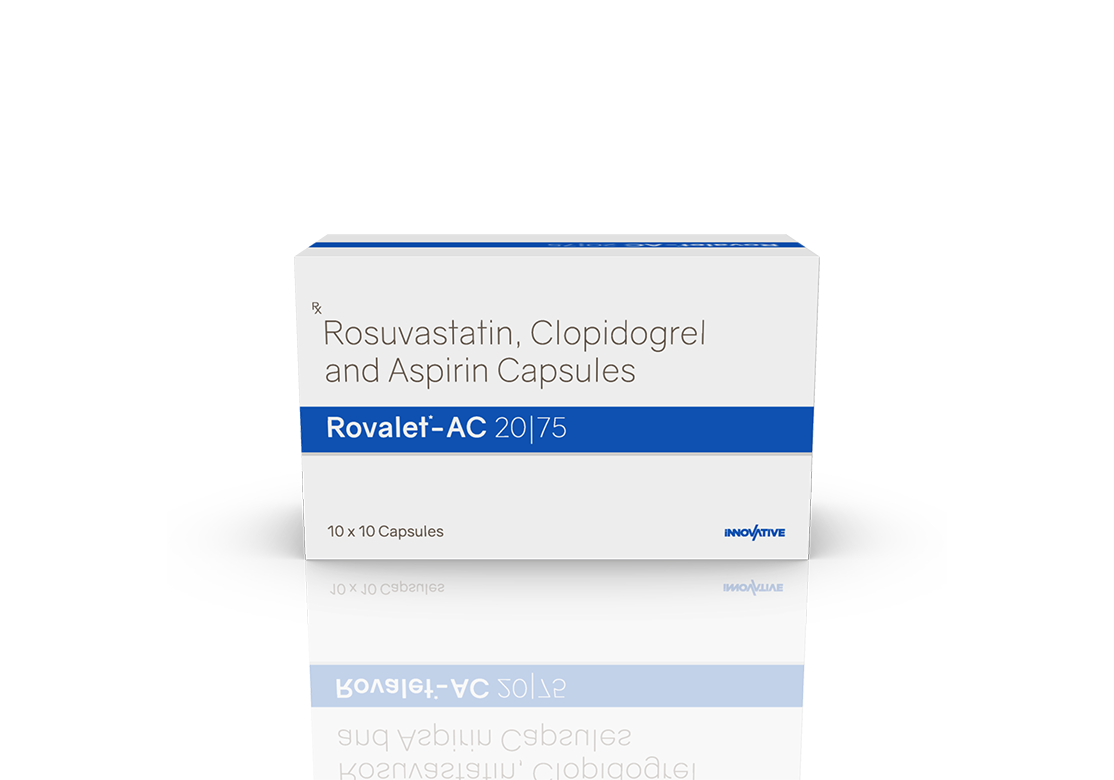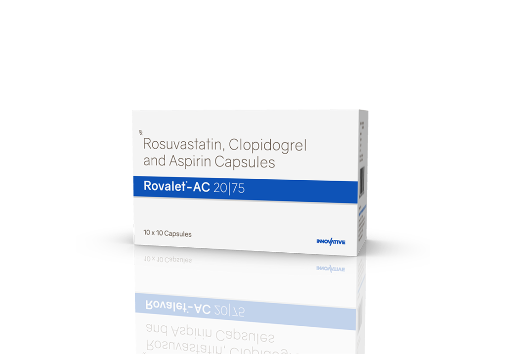 Rovalet-AC 20 | 75 Capsules Rosuvastatin 20 mg, Aspirin 75 mg (EC) & Clopidogrel 75 mg Pack : 1 x 10 Capsules Alu-Alu Pack Enquiry Categories: Cardio Diabetic Care, Nephrologist, Pharma, Physician, Specialities Tag: Pharma Description Additional information Description Rovalet-AC 20 | 75 Capsules Composition : Rosuvastatin 20 mg, Aspirin 75 mg (EC) & Clopidogrel 75 mg Therapeutic Segment : Lipid Lowering Agents | Anti- Platelet Packing : 1 x 10 Capsules (Alu-Strip Pack) Indications : Hyperlipidaemias Prophylaxis of Cardiovascular events in high risk Patients Dsylipidemia Primary Prevention of MI, Stroke and arterial revascularization Dosage : As directed by Physician Product Enquiry Product Information Product DescriptionRovalet-AC 20 | 75 Capsules is used for prevention of heart attack, stroke and treatment of peripheral vascular disease. It is a combination of medicines that prevent clot formation in the blood vessels. It also helps to reduce increased cholesterol and triglycerides levels. Benefits Prevention of Heart attack Prevention of Angina (heart-related chest pain) Prevention of Stroke Direction For Use Take this medicine in the dose and duration as advised by your doctor. Swallow it as a whole. Mechanism of ActionRosuvastatin reduces LDL (bad) cholesterol and triglyceride levels while increasing HDL (good) cholesterol, helping prevent the buildup of plaque in the arteries and reducing the risk of heart attacks, strokes, and other heart-related issues. Aspirin (EC): Helps prevent the formation of blood clots by inhibiting the enzyme COX-1, which reduces platelet aggregation, thus lowering the risk of heart attacks and strokes. Clopidogrel reduces the risk of blood clots by inhibiting platelet aggregation through ADP receptor inhibitin, enhancing the antiplatelet effect of Aspirin and further lowering clotting risk. Also AvailableRovalet 10 mg Tabletss | Rovalet 40 mg Tablets | Rovalet 5 mg Tablets | Rovalet-A 10 | 150 Capsules | Rovalet-A 10 | 75 Capsules | Rovalet-A 20 | 150 Capsules | Rovalet-A 20 | 75 Capsules | Rovalet-AC 10 | 150 Capsules | Rovalet-AC 10 | 75 Capsules | Rovalet-AC 20 | 150 Capsules | Rovalet-C Capsules | Rovalet-E Tablets | Rovalet-F Tablets Additional information Dosage Form Capsules Therapeutic Segment Antiplatelets, Lipid Lowering Agent ENQUIRY! Related Products Atrosure-A 20 | 75 Capsules Atorvastatin 20 mg & Aspirin 75 mg Pack : 1 x 10 Alu-Alu Pack ENQUIRY! Enquiry Rovalet-C Capsules Rosuvastatin 10 mg & Clopidogrel 75 mg Pack : 1 x 10 Capsules Alu-Alu Pack ENQUIRY! Enquiry Rovalet-AC 10 | 75 Capsules Rosuvastatin 10 mg, Aspirin 75 mg (EC) & Clopidogrel 75 mg Pack : 1 x 10 Capsules Alu-Alu Pack ENQUIRY! Enquiry Atrosure-AC 10 | 150 Capsules Atorvastatin 10 mg, Aspirin 150 mg & Clopidogrel 75 mg Pack : 1 x 10 Alu-Alu Pack ENQUIRY! Enquiry Related products Aclopride-MR Tablets (Blister) Aceclofenac 100 mg, Paracetamol 325 mg & Chlorzoxazone 250 mg Pack : 1 x 10 Tablets Blister Pack ENQUIRY! Enquiry Algra 100 mg Tablets Sildenafil Citrate 100 mg Pack : 1 x 4 Blister Pack in Mono Carton ENQUIRY! Enquiry Altum Plus Tablet Albendazole 400 mg & Ivermectin 6 mg Tablet Pack : 1 x 10 Blister Pack in Mono Carton ENQUIRY! Enquiry Alconix 500 mg Tablets Disulfiram 500 mg Pack : 1 x 4 Blister in Mono Carton ENQUIRY! Enquiry