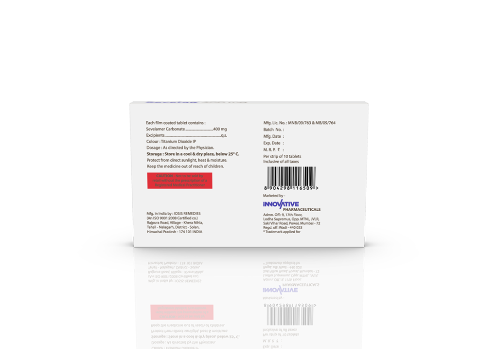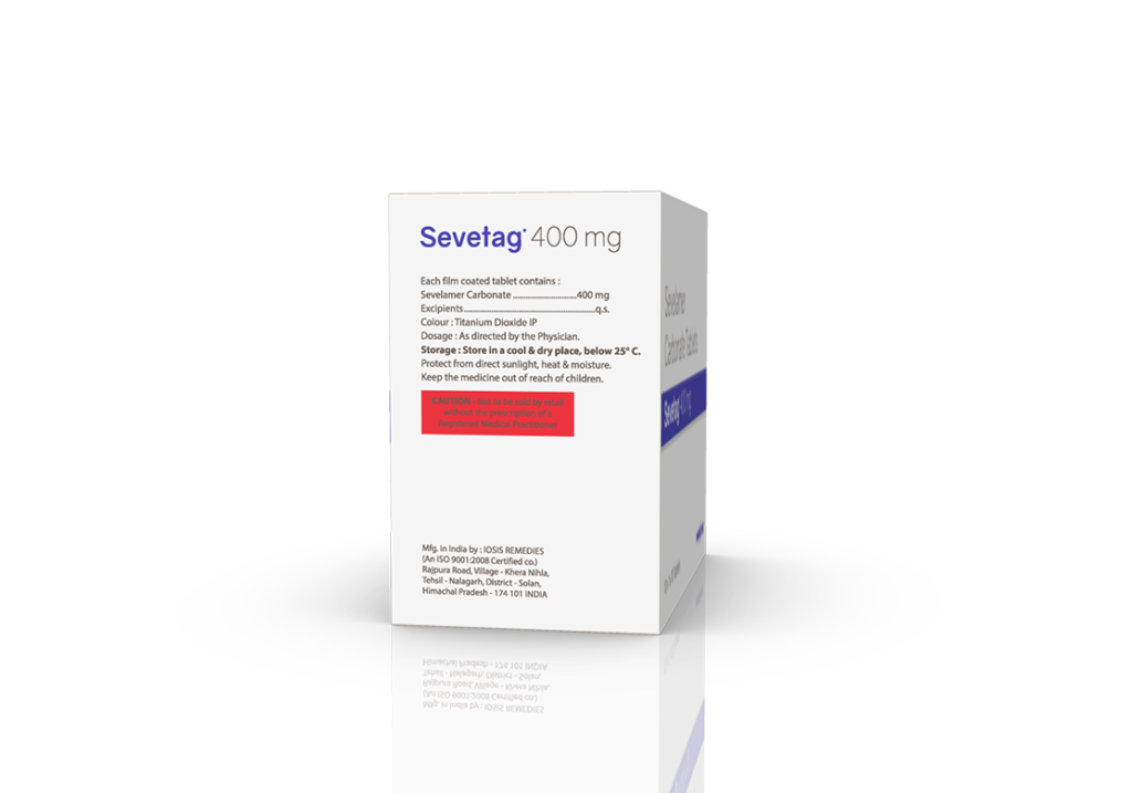 Sevetag 400 mg Tablets Sevelamer 400 mg Pack : 1 x 10 Tablets Alu-Alu Pack in Mono Carton Enquiry Categories: Nephrologist, Pharma, Specialities, Urology Care Tag: Pharma Description Additional information Description Sevetag 400 mg Tablets Composition : Sevelamer 400 mg Therapeutic Segment : Hyperphosphatemia Packing : 1 x 10 Tablets (Alu-Alu Pack) in Mono Carton Indications : Hyperphosphatemia Severe Kidney Disease Patient on Dialysis Dosage : 1 Tablet thrice daily or as directed by Physician Product Enquiry Product Information Product DescriptionSevetag 400 mg Tablets is used to treat increased phosphate levels in the blood. It is used in patients who are on dialysis due to severe kidney disease. It inhibits the absorption of phosphate from the intestine and lowers the phosphate levels in the blood. BenefitsHigh phosphate levels in blood Direction For Use Take this medicine in the dose and duration as advised by your doctor. Swallow it as a whole. Mechanism of ActionSevetag 400 mg Tablets inhibits the absorption of phosphate from the intestine and lower the phosphate levels in the blood. Also AvailableSevetag 800 mg Tablets Additional information Dosage Form Tablets Therapeutic Segment Hyperphosphatemia ENQUIRY! Related Products Sevetag 800 mg Tablets Sevelamer 800 mg Pack : 1 x 10 Tablets Alu-Alu Pack in Mono Carton ENQUIRY! Enquiry Related products Aclopride 100 mg DT Aceclofenac 100 mg DT Pack : 1 x 10 Tablets Alu-Alu Pack ENQUIRY! Enquiry Acetazone 250 mg Tablets Acetazolamide 250 mg Pack : 1 x 10 Blister Pack ENQUIRY! Enquiry Altum Plus Suspension Albendazole 200 mg & Ivermectin 1.5 mg / 5 ml Pack : 10 ml Bottle in Mono Carton ENQUIRY! Enquiry Altum Tablet Albendazole 400 mg Pack : 1 Tab Blister Pack ENQUIRY! Enquiry