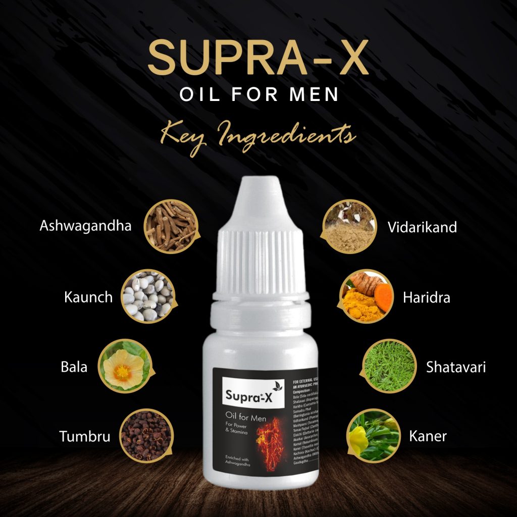 Supra-X Oil Enquiry Categories: Ayurvedic, Ayurvedic Care Description Additional information Description Supra-X OilVigour & Vitality Oil for Men | For Power & Stamina Therapeutic Segment : Vigour & Vitality Packing : 10 Capsules in Jar with mono carton Enriched with Bala Rt 10%, Shatavari Rt 20%, Haridra Rh 20%, Samudra Phal Fr 10%, Vidharikand Rh 20%, Mashparni Wh Plt 20%, Tomar/Tejbal Fr 40%, Elaichi Fr 5%, Akarkar Rt 20%, Kamal Fl 10%, Kaner Rt 20%, Kachora (Kachur) Rh 15%, Ashwagandha Rt 20% DescriptionKey IngredientsBenefitsDirections for UseDescriptionStress, chronic illness, disinterest, injury, erectile dysfunction, hormonal imbalance or just relationship strife, sexual dissatisfaction can bring about additional physical and mental health problems. Hence, low libido, sexual drive, and the related problems should be attended to at once. Supra-X Oil is a combination of unique natural herbs known since ancient times that increase the power and girth of erection, it gives more pleasure during sex and it surely tones muscles. Supra-X Oil cleanses your aura, reduces stress, relaxes you and even vitalizes your body by healing you from the inside. It also helps you regain lost energy, solve problems of achieving sexual desire and arousal by treating the root issues which might be causing them. They also act as natural aphrodisiacs which stimulate your sexual drive and improve blood flow. Moreover, this traditional herb oil has the power of making you more potent, stimulating sexual desire and inducing a calming atmosphere in your intimate moments. It also carries powerful benefits which work towards reducing anxiety and engaging your sensual organs. Key Ingredients Elaichi Ashwagandha Akarkara HaridraBenefits An Ayurvedic formulation which is good for improving strength, stamina and power and beneficial in relieving general weakness Contains Aswagandha which helps to reduce stress Increases physical strength and endurance Increases sex drive Boosts sexual performance, Increases stamina & endurance Directions for UseTake 5-10 drops of Supra-X Oil, massage on the organs and pubic area at least one hour before sexual intercourse or as directed by the Physician Also Available Supra-X Capsules Additional information Dosage Form Oil Therapeutic Segment Vigour & Vitality ENQUIRY! Related Products Flucozest Gel Fluconazole 0.5% w/w Pack : 15 g Lami Tube in Mono Carton ENQUIRY! Enquiry Glycirest-M 80 Tablets Gliclazide 80 mg & Metformin 500 mg Tablets Pack : 1 x 10 Tablets Blister Pack ENQUIRY! Enquiry Baclosure 20 mg Tablets Baclofen 20 mg Pack : 1 x 10 (Alu-Alu) ENQUIRY! Enquiry Cetrasoft Plus Lotion White Soft Paraffin, Liquid Paraffin, Aloe Vera, Stearic Acid, Light Liquid Paraffin, Cetyl Alcohol, Glycerine Pack : 100 ml Bottle in mono carton ENQUIRY! Enquiry Related products Arogya Tulsi Plus Capsules 10 Caps ENQUIRY! Enquiry Bester Capsules 60 Caps ENQUIRY! Enquiry Leucodex Capsules ENQUIRY! Enquiry Bester – Handmade Sheesham Wood Comb 15 FC ENQUIRY! Enquiry