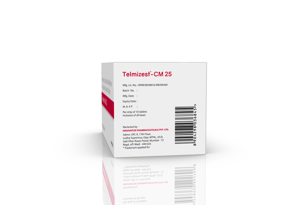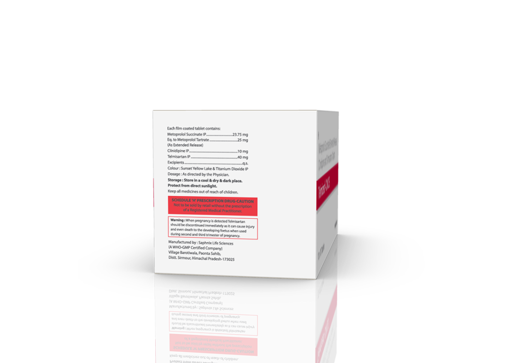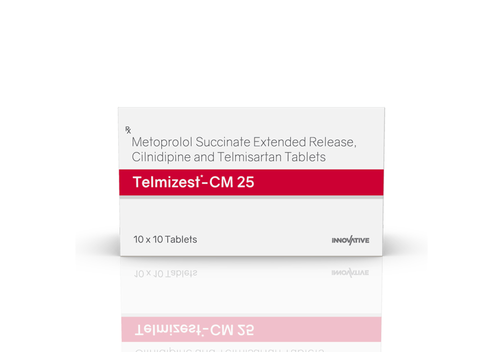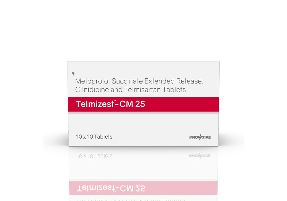 Telmizest-CM 25 mg Tablets Telmisartan 40 mg, Cilnidipine 10 mg & Metoprolol Succinate (ER) 25 mg Pack : 1×10 Tablets (Alu-Alu Pack) Enquiry Categories: Cardio Diabetic Care, General Practitioner, Pharma, Physician, Specialities Tag: Pharma Description Additional information Description Telmizest-CM 25 mg Tablets Composition: Telmisartan 40 mg, Cilnidipine 10 mg & Metoprolol Succinate (ER) 25 mg Therapeutic Segment: Calcium Antagonists Packing: 1×10 Tablets (Alu-Alu Pack) Indications : Severe Hypertension Angina Pectoris Treatment of Cardiac Failure Dosage: As directed by the Physician Product Enquiry Product Information Product DescriptionTelmisartan 40 mg, Cilnidipine 10 mg, and Metoprolol Succinate (ER) 25 mg is a combination medication used to treat high blood pressure (hypertension). Telmisartan is an angiotensin II receptor blocker (ARB), Cilnidipine is a calcium channel blocker, and Metoprolol Succinate is a beta-blocker. Together, these medications help relax blood vessels, reduce heart rate, and prevent fluid retention, effectively lowering blood pressure. Benefits Effectively lowers blood pressure Reduces the risk of heart attack, stroke, and kidney damage Provides a combination of three different mechanisms to control blood pressure Helps improve heart function and reduce fluid retention Direction For Use Take this medicine in the dose and duration as advised by your doctor. Swallow it as a whole. Do not chew, crush or break it. Mechanism of ActionTelmisartan helps relax and widen the blood vessels, which results in lower blood .Cilnidipine helps relax and widen blood vessels by preventing calcium from entering the cells of the blood vessel walls. This action leads to reduced blood pressure.Metoprolol Succinate This helps lower blood pressure and reduces the strain on the heart. Also AvailableTelmizest 20 mg Tablets | Telmizest 40 mg Tablets | Telmizest 80 mg Tablets | Telmizest-A 40 I 5 Tablets | Telmizest-A 80 Tablets | Telmizest-AH 40 Tablets | Telmizest-CC Tablets | Telmizest-CL 40 Tablets | Telmizest-CT 40 Tablets | Telmizest-CTH 40 Tablets | Telmizest-H 40 Tablets | Telmizest-H 80 Tablets | Telmizest-M 25 mg Tablets | Telmizest-M 50 mg Tablets | Telmizest-NB 40 Tablets Additional information Dosage Form Tablets Therapeutic Segment Calcium Antagonists ENQUIRY! Related Products Azelnet 16 mg Tablets Azelnidipine 16 mg Pack: 1 x 10 (Blister) Pack ENQUIRY! Enquiry Azelnet 8 mg Tablets Azelnidipine 8 mg Pack: 1 x 10 (Alu-Alu Pack) ENQUIRY! Enquiry Related products Aclopride-SP Tablets Aceclofenac 100 mg, Paracetamol 325 mg & Serratiopeptidase 15 mg Pack : 1 x 10 Blister Pack ENQUIRY! Enquiry Aclopride Gel Aceclofenac, Linseed Oil, Methyl Salicylate, Menthol & Capsaicin Pack : 30 g Lami Tube In Mono Carton ENQUIRY! Enquiry Aclopride-TA Tablets Aceclofenac 100 mg, Tramadol 37.5 mg & Paracetamol 325 mg Pack : 1 x 10 Tablets Blister Pack ENQUIRY! Enquiry Alconix 500 mg Tablets Disulfiram 500 mg Pack : 1 x 4 Blister in Mono Carton ENQUIRY! Enquiry