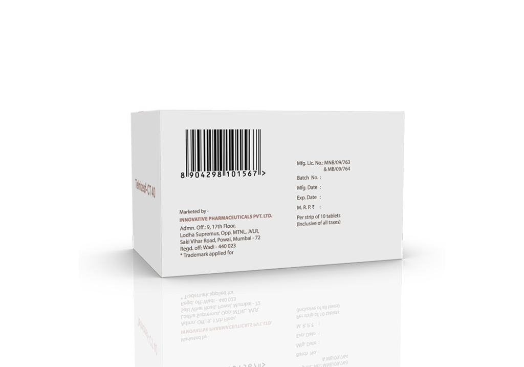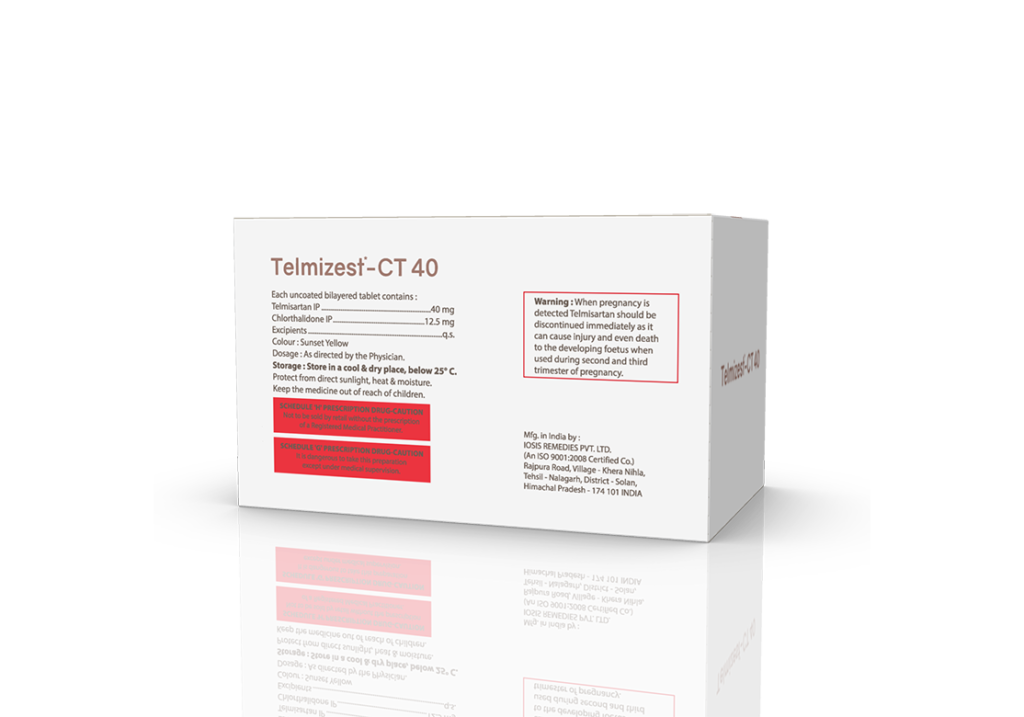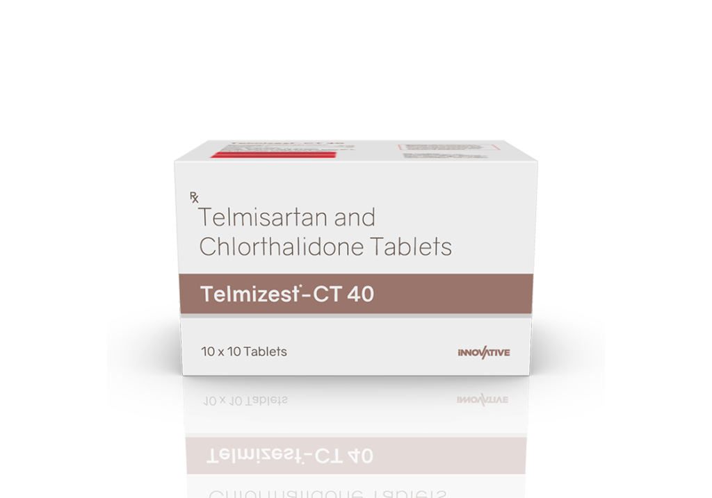 Telmizest-CT 40 Tablets Telmisartan 40 mg & Chlorthalidone 12.5 mg Pack : 1 x 10 Tablets Alu-Alu Pack Enquiry Categories: Cardio Diabetic Care, Pharma, Physician, Specialities Tag: Pharma Description Additional information Description Telmizest-CT 40 Tablets Composition : Telmisartan 40 mg & Chlorthalidone 12.5 mg Therapeutic Segment : Antihypertensive Packing : 1 x 10 Tablets (Alu-Alu Pack) Indications : Hypertension | Congestive Heart Failure Heart Attack | Diabetic Kidney Disease Dosage : 1 Tablet once daily or as directed by Physician Product Enquiry Product Information Product DescriptionTelmisartan + Chlorthalidone is used in the treatment of Hypertension (high blood pressure). Benefits Hypertension Congestive Heart Failure Heart Attack Diabetic kidney disease Direction For Use Take this medicine in the dose and duration as advised by your doctor. Swallow it as a whole. Do not chew, crush or break it. Mechanism of ActionTelmisartan and chlorthalidone, which lowers blood pressure effectively. Telmisartan is an angiotensin receptor blocker (ARB). It works by blocking the hormone angiotensin thereby relaxing blood vessels. This allows the blood to flow more smoothly and the heart to pump more efficiently. Chlorthalidone is a diuretic that removes extra water and certain electrolytes from the body. Over time it also relaxes blood vessels and improves blood flow. Also AvailableTelmizest 20 mg Tablets | Telmizest 40 mg Tablets | Telmizest 80 mg Tablets | Telmizest-A 40 I 5 Tablets | Telmizest-A 80 Tablets | Telmizest-AH 40 Tablets | Telmizest-CC Tablets | Telmizest-CL 40 Tablets | Telmizest-CTH 40 Tablets | Telmizest-H 40 Tablets | Telmizest-H 80 Tablets | Telmizest-M 25 mg Tablets | Telmizest-M 50 mg Tablets | Telmizest-NB 40 Tablets Additional information Dosage Form Tablets Therapeutic Segment Antihypertensive ENQUIRY! Related Products Prolet 40 mg Tablets Propranolol Hydrochloride 40 mg Pack : 1 x 10 Tablet Blister Pack ENQUIRY! Enquiry Azilcare 80 mg Tablets Azilsartan Medoxomil 80 mg Pack : 1 x 10 Tablets Alu-Alu Pack ENQUIRY! Enquiry Telmizest-CL 40 Tablets Telmisartan 40 mg & Cilnidipine 10 mg Pack : 1 x 10 Tablets Alu-Alu Pack in Mono Carton ENQUIRY! Enquiry Ramilet 2.5 mg Tablets Ramipril 2.5 mg Pack : 1 x 10 Tablets Alu-Alu Pack ENQUIRY! Enquiry Related products Aclopride Gel Aceclofenac, Linseed Oil, Methyl Salicylate, Menthol & Capsaicin Pack : 30 g Lami Tube In Mono Carton ENQUIRY! Enquiry Alconix 500 mg Tablets Disulfiram 500 mg Pack : 1 x 4 Blister in Mono Carton ENQUIRY! Enquiry Aclopride-D Tablets Aceclofenac 100 mg & Drotaverine 80 mg Pack : 1 x 10 Tablets Blister Pack ENQUIRY! Enquiry Aclopride-TA Tablets Aceclofenac 100 mg, Tramadol 37.5 mg & Paracetamol 325 mg Pack : 1 x 10 Tablets Blister Pack ENQUIRY! Enquiry