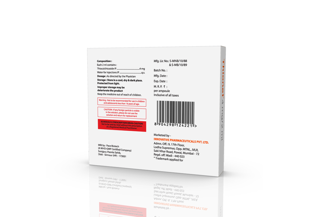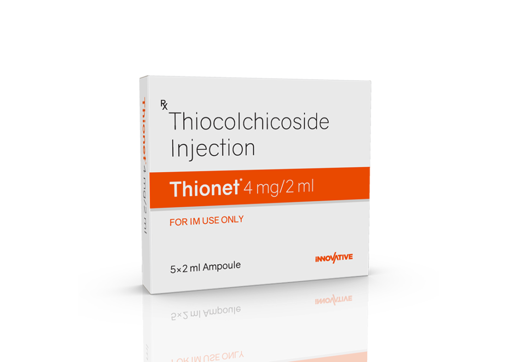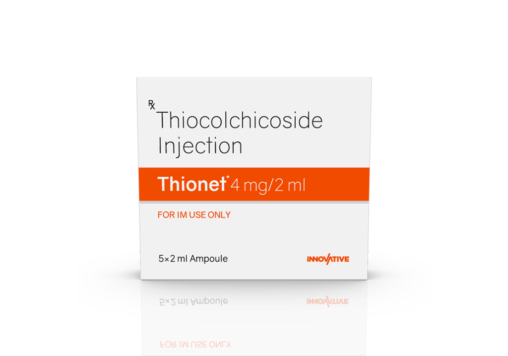Thionet Injection Thiocolchicoside 4 mg / 2 ml Pack : 2 ml Clear Ring Ampoule in Tray 5 x 2 ml with Outer Carton Enquiry Categories: Injectable Care, Orthopaedic Care, Pharma, Specialities Tag: Pharma Description Additional information Description Thionet Injection Composition : Thiocolchicoside 4 mg / 2 ml Therapeutic Segment : Muscle Relaxants Packing : 2 ml Clear Ring Ampoule in Tray 5 x 2 ml with Outer Carton Indications : As an adjuvant treatment in painful spasm associated with degenerative vertebral disorders Dorsal Pain Low Back Pain Traumatic & neurological disorders Dosage : As directed by Physician Also Available Thionet 4 mg Capsules | Thionet Gel Additional information Dosage Form Injectable Therapeutic Segment Muscle Relaxant ENQUIRY! Related Products Aclopride-MR Tablets (Blister) Aceclofenac 100 mg, Paracetamol 325 mg & Chlorzoxazone 250 mg Pack : 1 x 10 Tablets Blister Pack ENQUIRY! Enquiry Erocoxib-MR 4 mg Tablets Etoricoxib 60 mg & Thiocolchicoside 4 mg Pack : 1 x 10 Tablets Blister Pack in Mono Carton ENQUIRY! Enquiry Aclopride-TH8 Tablets Aceclofenac 100 mg & Thiocolchicoside 8 mg Pack : 1 x 10 Alu-Alu Pack ENQUIRY! Enquiry Aclopride-MR Tablets (Alu-Alu) Aceclofenac 100 mg, Paracetamol 325 mg & Chlorzoxazone 250 mg Pack : 1 x 10 Tablets Alu-Alu Pack ENQUIRY! Enquiry Related products Aclopride-TH Tablets Aceclofenac 100 mg & Thiocolchicoside 4 mg Pack : 1 x 10 Alu-Alu Pack ENQUIRY! Enquiry Aclopride Gel Aceclofenac, Linseed Oil, Methyl Salicylate, Menthol & Capsaicin Pack : 30 g Lami Tube In Mono Carton ENQUIRY! Enquiry Aclopride-TA Tablets Aceclofenac 100 mg, Tramadol 37.5 mg & Paracetamol 325 mg Pack : 1 x 10 Tablets Blister Pack ENQUIRY! Enquiry Aclopride 100 mg DT Aceclofenac 100 mg DT Pack : 1 x 10 Tablets Alu-Alu Pack ENQUIRY! Enquiry